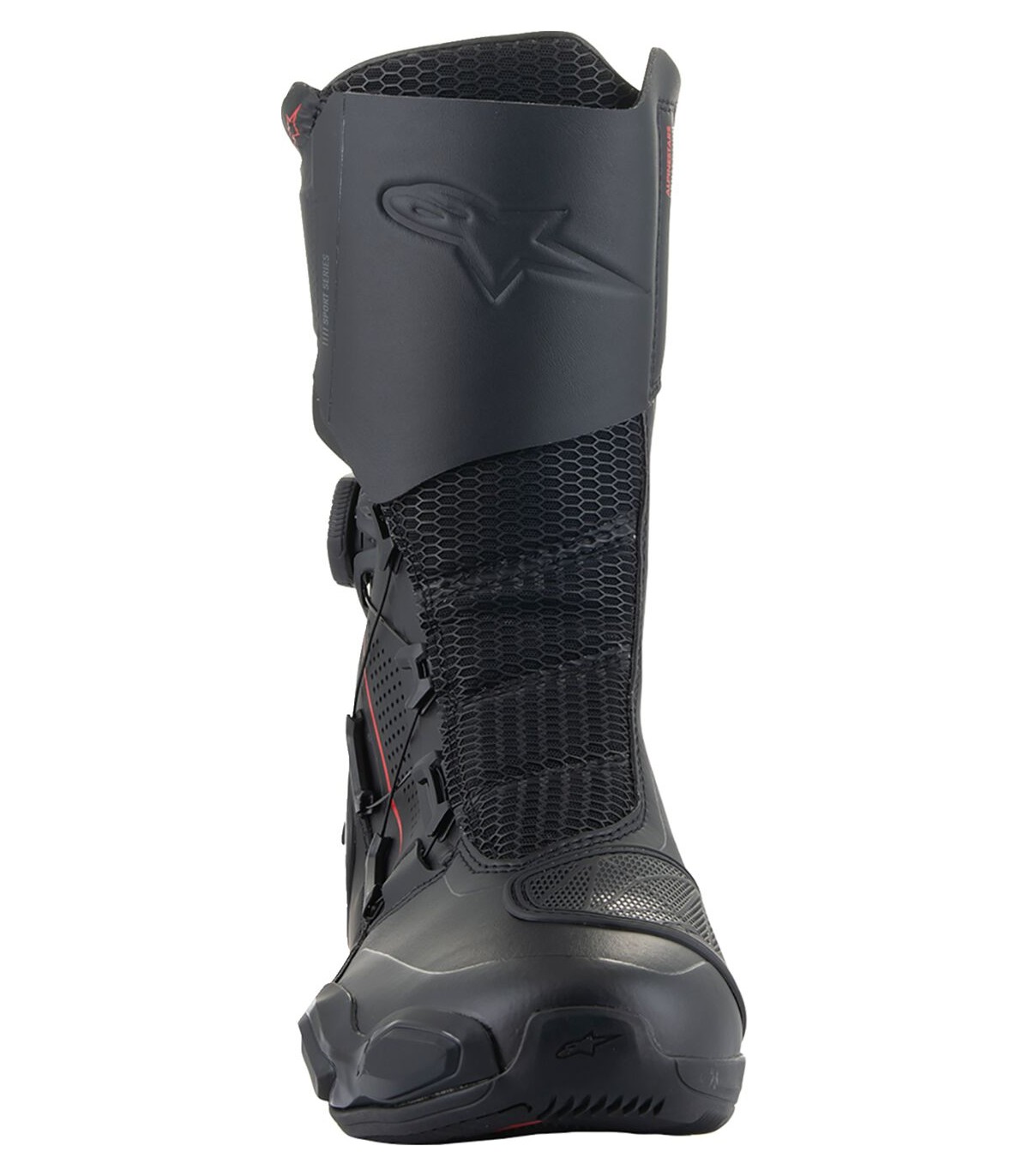 SP-X BOA BootsSP-X boots are a sleek sport boot designed to fit under tech riding pants and provide superior walking capabilityOptimized for the sport and sport touring rider, the SP-X are compact, mid-height boots with premium levels of protection and comfort on and off the bikeThe upper is constructed from a combination of Rideknit® material and knitted mesh, plus seamless thermo-welded partsThe lower features a TPU heel counter, toe slider, and the Alpinestars Transversal Protection Frame (TPF) on the sole, allowing for high levels of protection against impacts and any bending or twistingAdditionally, the sole also features an all-new design with an asymmetric back heel to facilitate the rider's natural stride and promote off-bike stabilityFor protection, the SP-X has an integrated shin impact protector, dual-density ankle discs, plus TPU shift pad and toe slider reinforcementFor comfort, the knitted areas on the front and back flex points offer great freedom of movement, while the PU midsole with integrated double cushioned heel compound and removable OrthoLite® insock, provide great walking comfortIn and out is facilitated by a medial zip combined with the BOA speed lace system for compact and precise closureSP-X boots are perfect for those sport riders looking for coverage and protection but without the full race boot, over the pant look