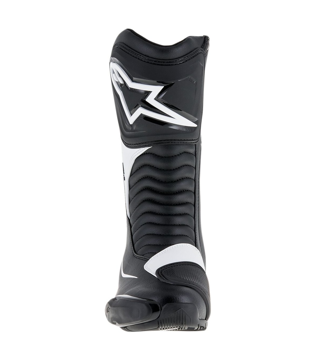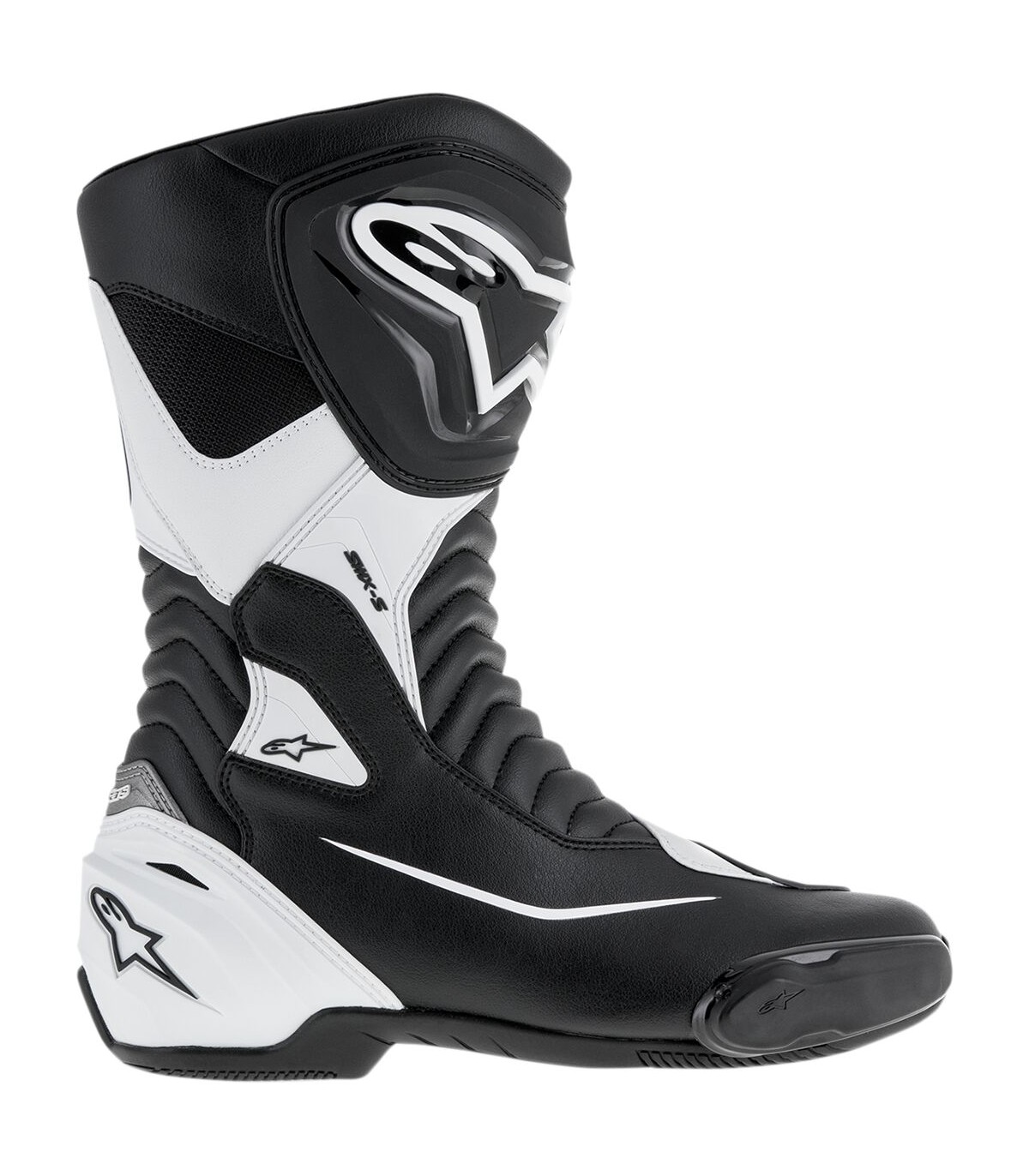SMX-S BootsDurable microfiber upper for comfort and fit and incorporating a host of advanced protective features, inside and out, the SMX-S Boot features an ergonomic forefoot shaping, a breathable lining and Alpinestars’ exclusive rubber compound sole for optimized levels of support and performanceDurable, high-tech micro-fiber upper construction offering a high level of flexibilityDouble injected Polyurethane (PU) shields the shin, ankle, calf, toe and heel from impact while minimizing abrasionInner protection is given by a double injected panel connected to the heel counter, hidden beneath the outer shell and running up the outer ankleQuick drying polyamide lining is laminated with open cell foam and high density contoured padding to absorb shocks to the foot areaExclusive compound rubber sole features structured shank reinforcement for added support to the arch areaInterchangeable bi-injected PU toe slider with snap-in assemblyInnovative air vents at the ankle, heel and forefoot are covered with a specially designed mesh to provide unmatched levels of rider comfortLarge ‘throat’ profile instep and Achilles flex bellows for superior flex and comfortMTP mesh liner and anatomical, removable, PU Foam foot bed keeps the foot cool and comfortableInnovative inner (medial) side entry opening/closure system that features an elastic mounted zipper with an extra wide Velcro® flap, to give a precise, comfortable fit and wide opening aperture for ease of accessHighly ergonomic last for ultra precise fit