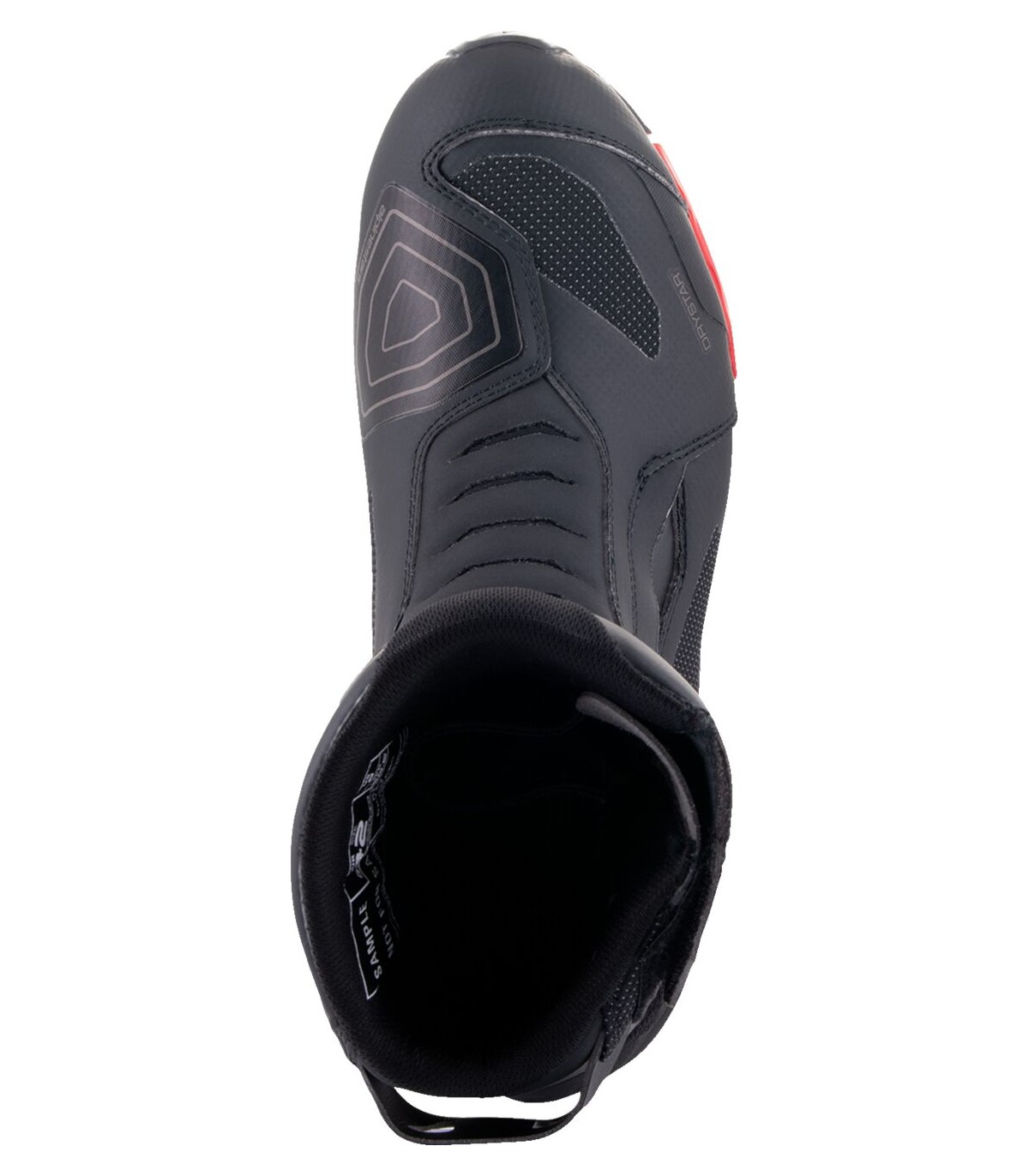 RT-7 Drystar® BootsRT-7 has a full Drystar® membrane for 100% guaranteed waterproof performance and breathabilityTechnical modern upper constructed with an advanced blend of microfiber and synthetic high resistance textile laminated by a seamless PU for enhanced breathability Alpinestars integrated Transversal Protection Frame (TPF), protects the foot while delivering the necessary support on the footrest without compromising the front foot flexion for superior walking comfortReinforced heel counter and toe box, with an additional shift pad extra later and reinforced shin area to protect against impactsThe boot opening is managed by lateral zip mounted elasticated panel, covered by a hook and loop gusseted flap, to protect the zipper and keep free the boot flexionDynamic design shift pad in 3D printed PU technology for effective upper foot protection