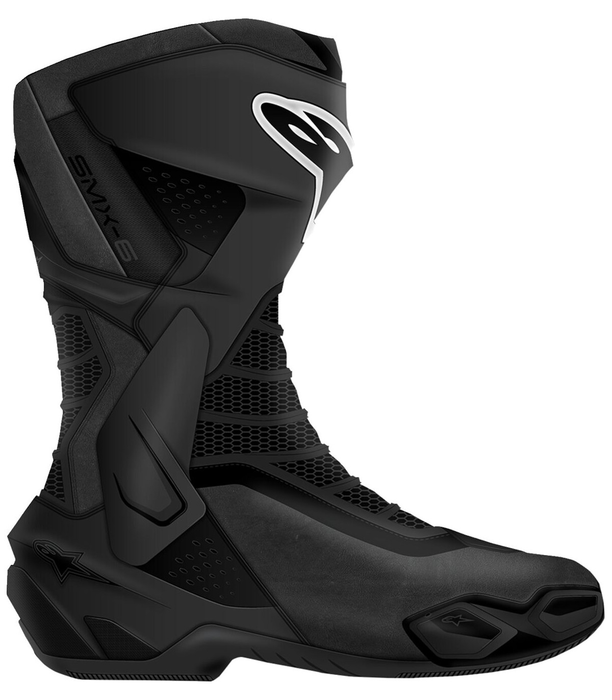 SMX-6 V3 BootsPacked with a host of innovative safety and protective features, SMX-6 V3 is the ultimate track and performance riding all-rounder, and incorporates race-derived technology and materials to give riders a crucial performance edge on the track, and the streetAdvanced microfiber upper construction for lightweight high performance protection against abrasion and superb levels of flexibilityFront flex and back flexion zones are constructed with textile over-injected with a soft Thermoplastic Polyurethane (TPU) for enhanced impact abrasion while also promoting a natural forwards and backwards movementAlpinestars unique ankle brace protection system provides a bio-mechanical support and protection between the lateral top calf, the shin and ankle, for superior ankle articulation, while also limiting hyper-torsion, hyper-extension and hyper-flexion, as well as providing Achilles and ankle impact protectionAlpinestars Lace-Lock System is constructed from an advanced polymer resin for a guaranteed quick, precise and secure closureEquipped with a TPU shifter zone for superior protection on the lower medial sideStrategically positioned, race-derived TPU shin plate protector delivers superior impact and abrasion resistanceDual density TPU ankle protectors are strategically positioned between the upper and padded lining to provide the strategic protection in key areasReplaceable, dual density TPU toe slider with screw-in assembly provides comprehensive protective coverage around the outer toe area while still being supremely flexible for walking comfortReplaceable heel slider and external side heel slider are strategically positioned for optimum shock dissipation and absorption, while promoting sliding in the event of an accident