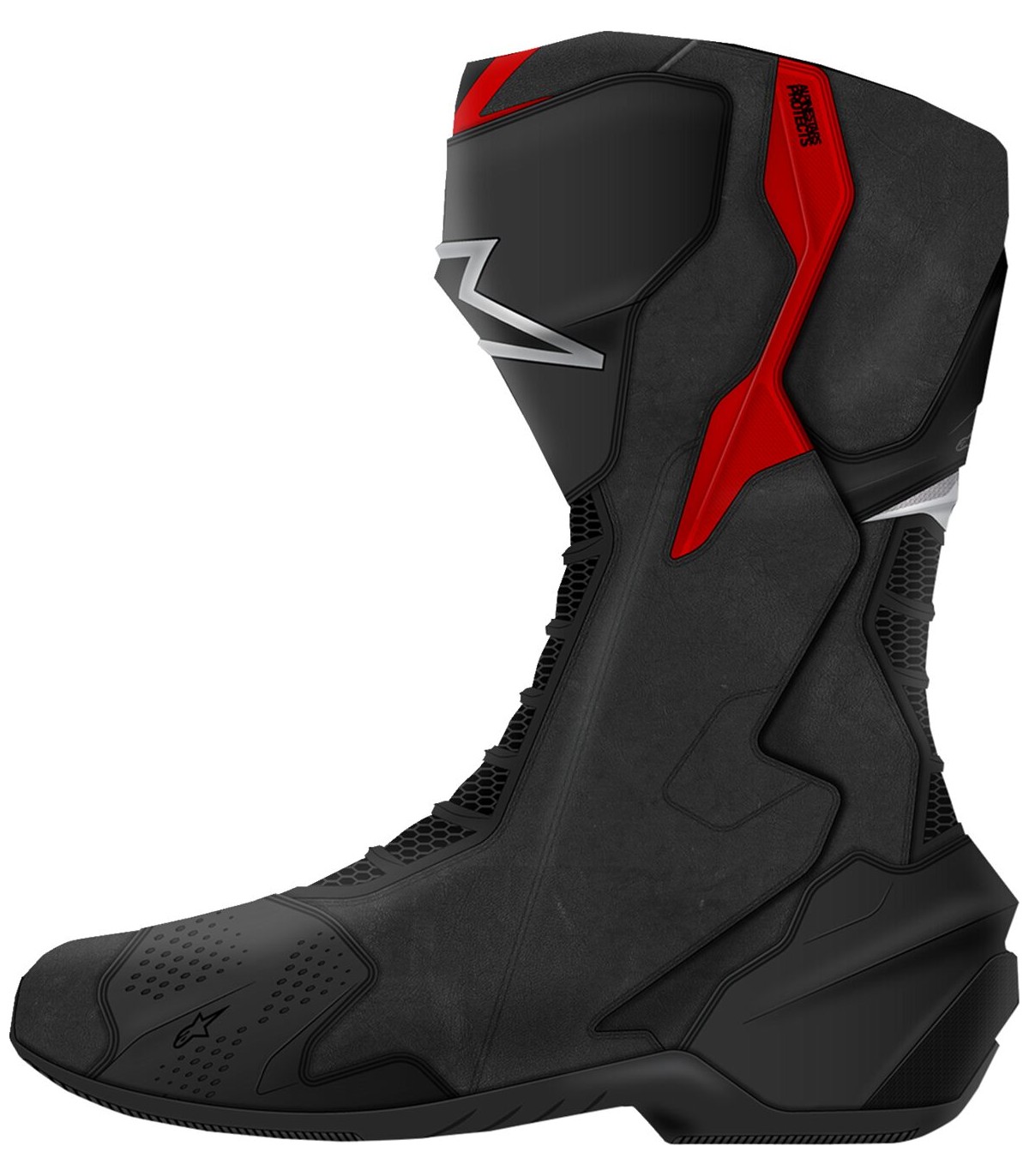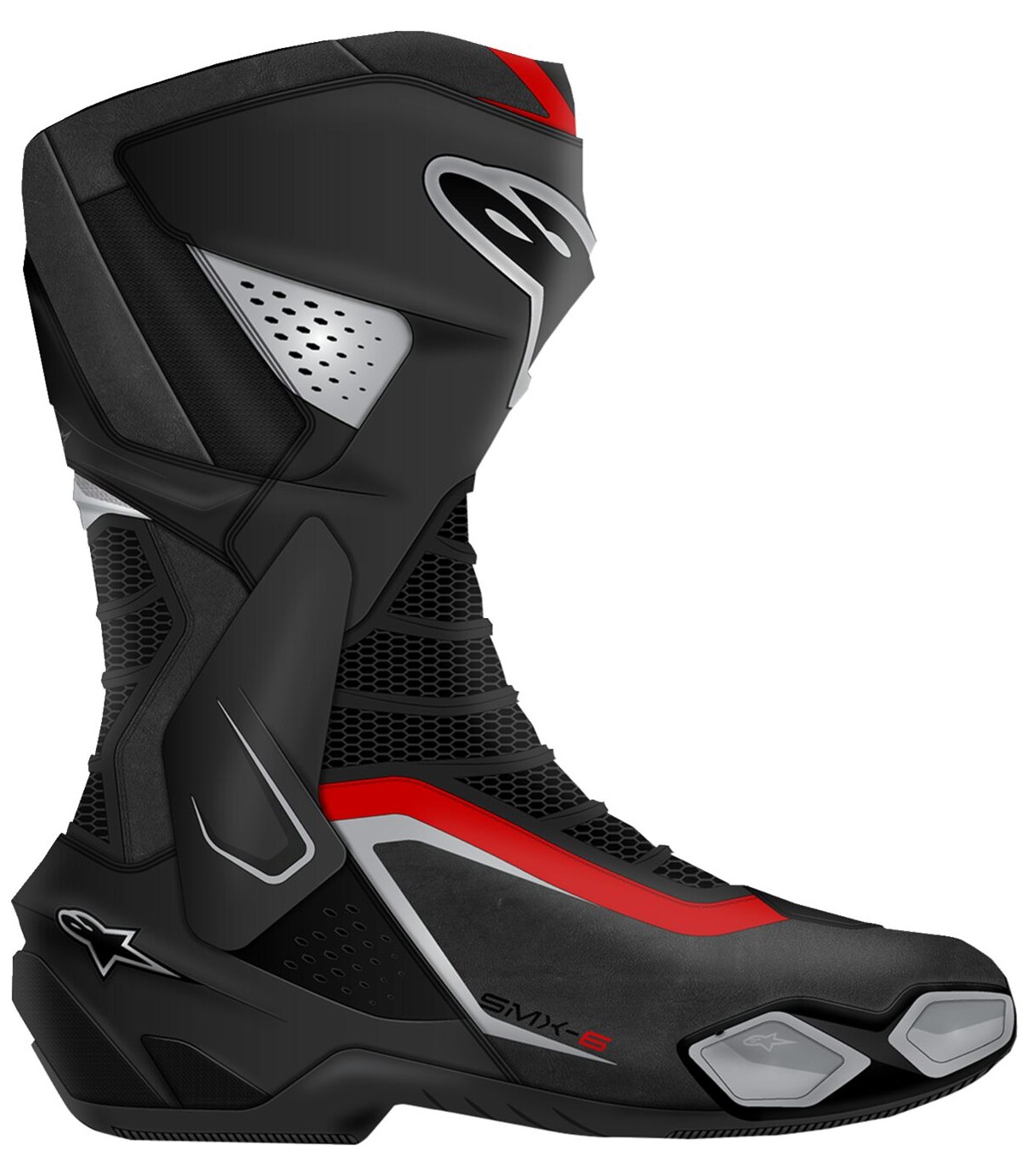 SMX-6 V3 BootsPacked with a host of innovative safety and protective features, SMX-6 V3 is the ultimate track and performance riding all-rounder, and incorporates race-derived technology and materials to give riders a crucial performance edge on the track, and the streetAdvanced microfiber upper construction for lightweight high performance protection against abrasion and superb levels of flexibilityFront flex and back flexion zones are constructed with textile over-injected with a soft Thermoplastic Polyurethane (TPU) for enhanced impact abrasion while also promoting a natural forwards and backwards movementAlpinestars unique ankle brace protection system provides a bio-mechanical support and protection between the lateral top calf, the shin and ankle, for superior ankle articulation, while also limiting hyper-torsion, hyper-extension and hyper-flexion, as well as providing Achilles and ankle impact protectionAlpinestars Lace-Lock System is constructed from an advanced polymer resin for a guaranteed quick, precise and secure closureEquipped with a TPU shifter zone for superior protection on the lower medial sideStrategically positioned, race-derived TPU shin plate protector delivers superior impact and abrasion resistanceDual density TPU ankle protectors are strategically positioned between the upper and padded lining to provide the strategic protection in key areasReplaceable, dual density TPU toe slider with screw-in assembly provides comprehensive protective coverage around the outer toe area while still being supremely flexible for walking comfortReplaceable heel slider and external side heel slider are strategically positioned for optimum shock dissipation and absorption, while promoting sliding in the event of an accident