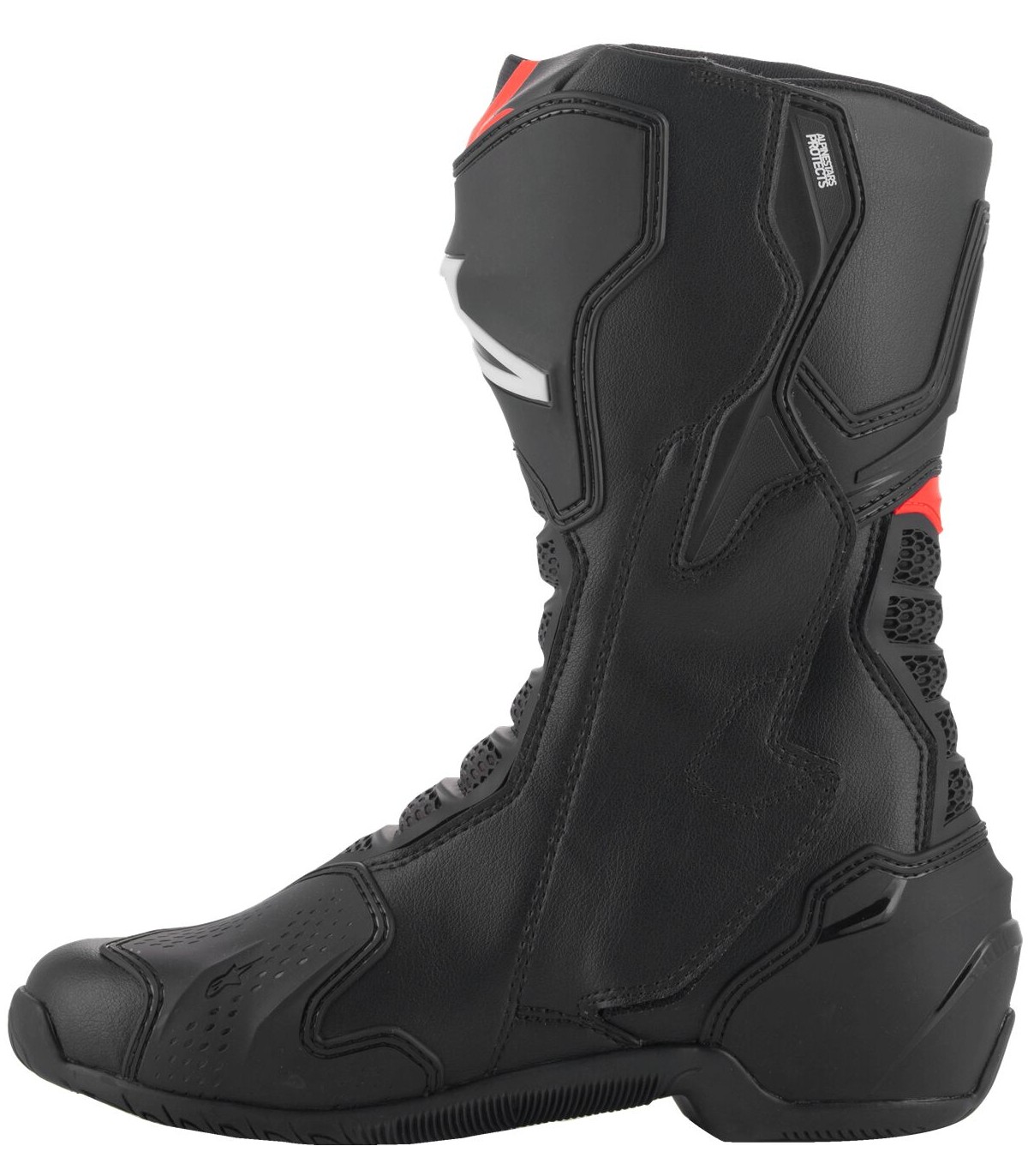 SMX-6 V3 BootsPacked with a host of innovative safety and protective features, SMX-6 V3 is the ultimate track and performance riding all-rounder, and incorporates race-derived technology and materials to give riders a crucial performance edge on the track, and the streetAdvanced microfiber upper construction for lightweight high performance protection against abrasion and superb levels of flexibilityFront flex and back flexion zones are constructed with textile over-injected with a soft Thermoplastic Polyurethane (TPU) for enhanced impact abrasion while also promoting a natural forwards and backwards movementAlpinestars unique ankle brace protection system provides a bio-mechanical support and protection between the lateral top calf, the shin and ankle, for superior ankle articulation, while also limiting hyper-torsion, hyper-extension and hyper-flexion, as well as providing Achilles and ankle impact protectionAlpinestars Lace-Lock System is constructed from an advanced polymer resin for a guaranteed quick, precise and secure closureEquipped with a TPU shifter zone for superior protection on the lower medial sideStrategically positioned, race-derived TPU shin plate protector delivers superior impact and abrasion resistanceDual density TPU ankle protectors are strategically positioned between the upper and padded lining to provide the strategic protection in key areasReplaceable, dual density TPU toe slider with screw-in assembly provides comprehensive protective coverage around the outer toe area while still being supremely flexible for walking comfortReplaceable heel slider and external side heel slider are strategically positioned for optimum shock dissipation and absorption, while promoting sliding in the event of an accident