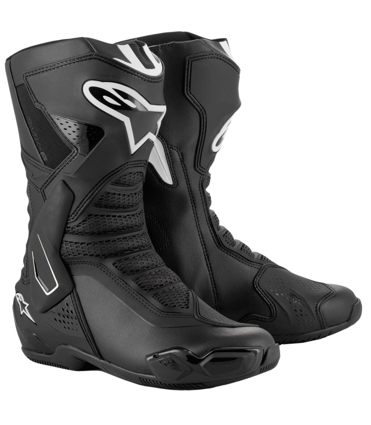 SMX-6 V3 BootsPacked with a host of innovative safety and protective features, SMX-6 V3 is the ultimate track and performance riding all-rounder, and incorporates race-derived technology and materials to give riders a crucial performance edge on the track, and the streetAdvanced microfiber upper construction for lightweight high performance protection against abrasion and superb levels of flexibilityFront flex and back flexion zones are constructed with textile over-injected with a soft Thermoplastic Polyurethane (TPU) for enhanced impact abrasion while also promoting a natural forwards and backwards movementAlpinestars unique ankle brace protection system provides a bio-mechanical support and protection between the lateral top calf, the shin and ankle, for superior ankle articulation, while also limiting hyper-torsion, hyper-extension and hyper-flexion, as well as providing Achilles and ankle impact protectionAlpinestars Lace-Lock System is constructed from an advanced polymer resin for a guaranteed quick, precise and secure closureEquipped with a TPU shifter zone for superior protection on the lower medial sideStrategically positioned, race-derived TPU shin plate protector delivers superior impact and abrasion resistanceDual density TPU ankle protectors are strategically positioned between the upper and padded lining to provide the strategic protection in key areasReplaceable, dual density TPU toe slider with screw-in assembly provides comprehensive protective coverage around the outer toe area while still being supremely flexible for walking comfortReplaceable heel slider and external side heel slider are strategically positioned for optimum shock dissipation and absorption, while promoting sliding in the event of an accident