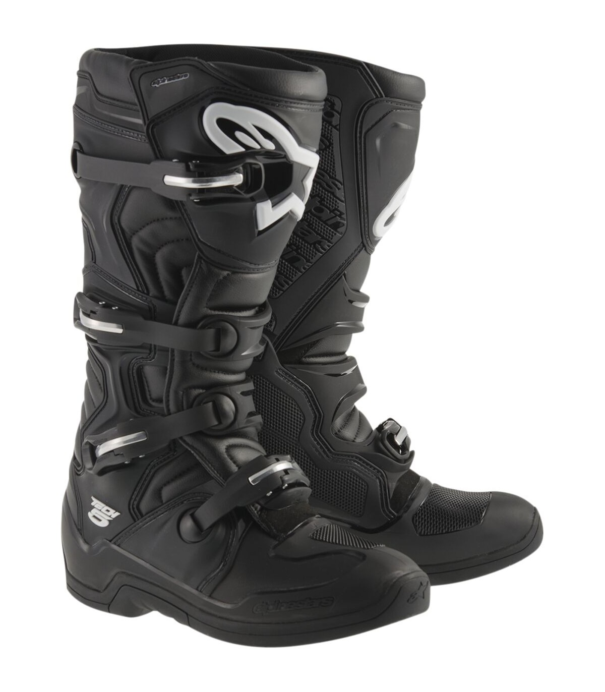 Tech 5 BootsUpper constructed from innovative, abrasion-resistant microfiber with synthetic polymer on toe boxMain microfiber material offers high levels of water-resistance, durability and improved weight-savingMaterial ensures consistent fit for long term usage and is easy to maintain and cleanRedesigned instep and Achilles accordion flex zones made from lightweight microfiber for superior comfort, control and supportContoured advanced polymer core structure envelopes upper boot for structural integrity and abrasion resistance while allowing excellent levels of controlled flexAnatomically profiled, high modulus polymer shin plate for superior impact and abrasion resistanceContoured shin plate allows for greater range of fitment and features a Velcro® adjustable panel for a personalized and secure closureMedial-facing biomechanical pivot system links lower and upper parts of the boot and gives front and rear flexibility and structural supportBoth the inward-facing upper and lower panels are constructed from specifically formulated polymer with grip sculpture patterning for maximum contact with bike and improved abrasion resistanceRear Thermoplastic Rubber (TPR) gaiter on top of the Thermoplastic Polyurethane (TPU) calf protector gives protection and comfortInnovative buckle closure system incorporates polymer and fiberglass buckle arms and high-impact aluminum bridge closures for durability and weight-savingBuckle system features memory and a quick release/locking system with self-aligning design for easy, precise closure and improved riding performance and securityAll buckles are easily replaceableTPU buckle straps are ergonomically profiled to promote high levels of front flexionInnovative one-piece TPU injected dual compound foot shell with excellent impact and abrasion resistance and unmatched levels of safetyShell is reinforced by a metal shank inside and toe reinforcement co-injected in harder compoundExclusive dual compound sole is seamlessly integrated to the multi-density foot base structure with built-in supportSole offers superior durability, grip and feel while ridingSole is replaceableTPU heel patch connected with shell and lateral/medial TPU parts, offers protection and supportSoft poly-foam surrounded the ankles and collar offer shock absorbing performance, plus full interior textile lining for comfortReplaceable anatomic EVA footbed with textile lining on top
