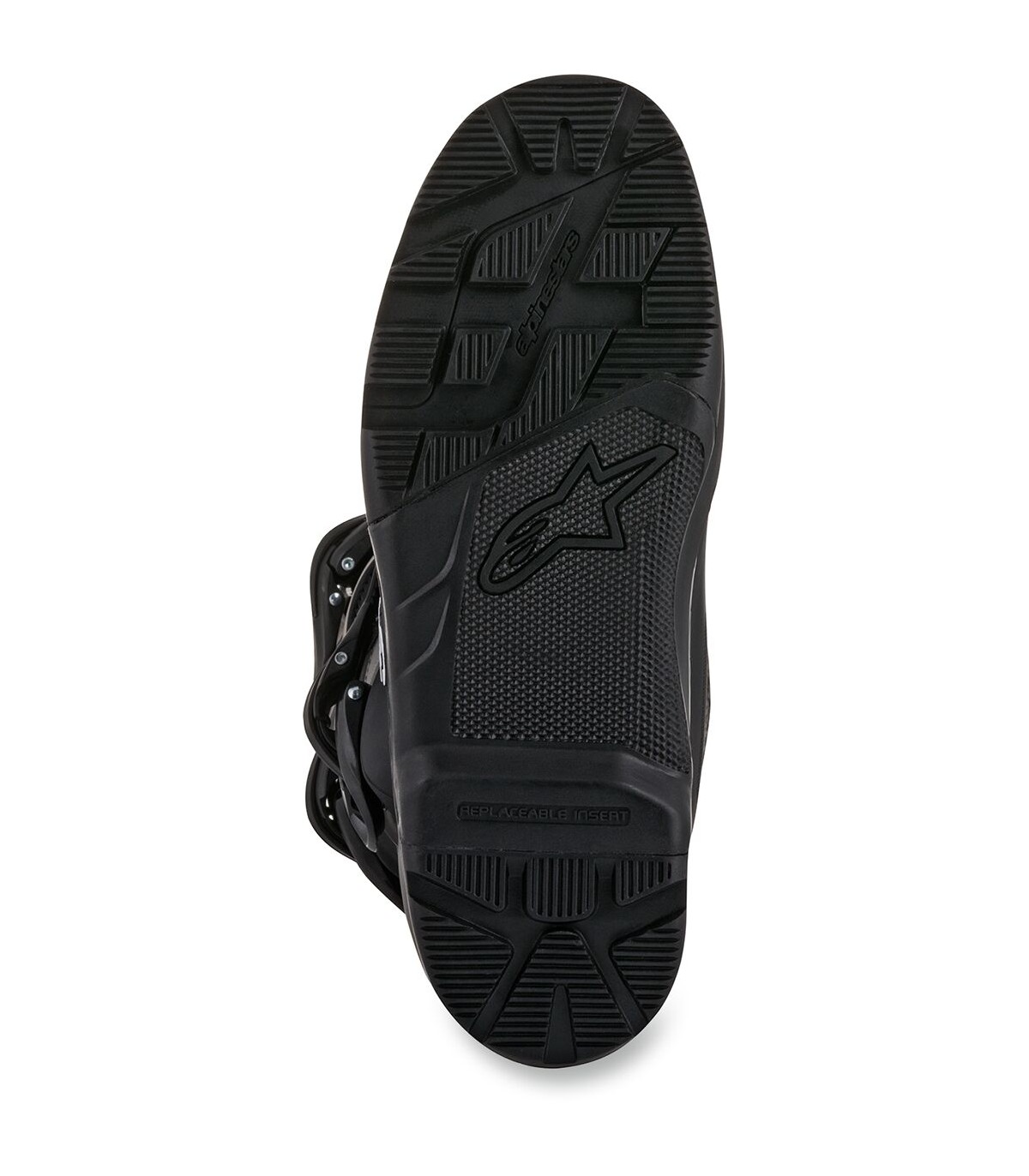 Tech 3 Enduro BootsBoot upper construction is an innovative, lightweight microfiber material that is flexible and abrasion-resistantLight microfiber on front and rear bellows provides a more comfortable flex areaToe box is made of synthetic material for high abrasion resistanceExtended Polyurethane (PU) synthetic gaiter helps seal out water and dirtContoured Thermoplastic Polyurethane (TPU) calf guard, TPU higher medial guard, TPU outer lateral ankle guard and TPU heel counter for support and resistance to impactsRear TPU gaiter patch applied on the top of the TPU calf protector for comfort and impact resistance on the rear flex areaInjected TPU shin plate is connected with the TPU medial guard panelHook-and-loop upper boot closure with TR flap that provides a wide range of fit and supportTPU higher medial protector designed with technical texturing for improved gripBiomechanical medial blade system allows good front/rear boot flex and added support and impact resistance for the ankleErgonomic TPU triple buckle straps wrap smoothly from the front flex and medial guard to the lateral side of the boot without compromising the boot's flexibilityClosure system uses three polymer buckles with ratchet closure, buckle memory system and quick release/locking system with a self-aligning designAll boot buckles are replaceableOne-piece TPU injected dual-compound foot shell is reinforced by a metal shank inside a co-injected toe reinforcementSoft foam surrounds the ankles and boot collar for comfort and shock-absorbing performanceEntire boot is textile lined for comfortReplaceable EVA footbed with textile top liningAlpinestars all-terrain sole design with high-grip rubber compounds; sole is replaceable