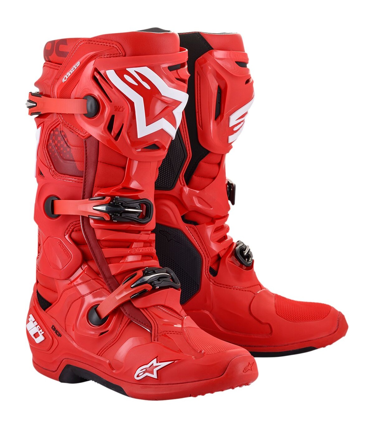 Tech 10 BootsCombines dual front and rear blade connectorsProvides a complete and seamless flexion control system, from the foot shell all the way up to the shin plateEngineered to 'float' freely between the lower and upper boot constructionAsymmetrical, dual pivot arms on boot frameA unique feature is the ankle control system developed in the outer shell construction, allowing natural ankle movement, vertical compression control and improved impact protectionAsymmetrical medial and lateral double pivot system for improved levels of flexibility and precision for both independent and synchronized movementRedesigned dual density Thermoplastic Polyurethane (TPU) rear blade system engineered to prevent hyper-extension while offering improved flex control and impact resistanceDynamic Heel Compression Protector (DHCP), an innovative safety feature which includes a fully integrated collapsible heel area with expanded poly-foam to absorb high impact energies during a crashFeatures lighter, anatomically redesigned medial and lateral torsion armsDouble pivot system allows the Tech 10 to retain its integrity while flexingLow-profile, pull-on design for reduce material build, less weight and to facilitate easier and quicker wearingInnovative flexion inserts work seamlessly with new flex support system for ultimate in performanceTPU protection and shock absorbing padding on the heel and anklesConstructed from a dual density compound and combined with the rear blade systemEnergy dissipating shin plate features a new anatomic design for reduced surface area and weight-savingCompletely redesigned sole with proprietary grip sculpturing to improve foot-peg performance, grip and mud and water run-offExclusive dual-compound sole is seamlessly integrated to the multi-density foot base structure with built-in supportSlim-line buckles include high-impact bridge closures which are cold forged for precision and strengthClosure system features contra-closure, doubling closure security and a quick release/locking system with self-aligning, memory, design for easy, precise closure and improved riding performance and securitySoles and buckles are easily replaceableChassis combines advanced lightweight microfiber and impact and abrasion resistant TPU shellFoot shell features five different compounds in a single lightweight piece to offer strength while maintaining flexibility and structural integritySoft microfiber gaiter helps seal out excessive water and dirt entryPoly-fabric lining with 3D open cell foam incorporates anti-slip suede in heel area, keeping the foot located inside the boot