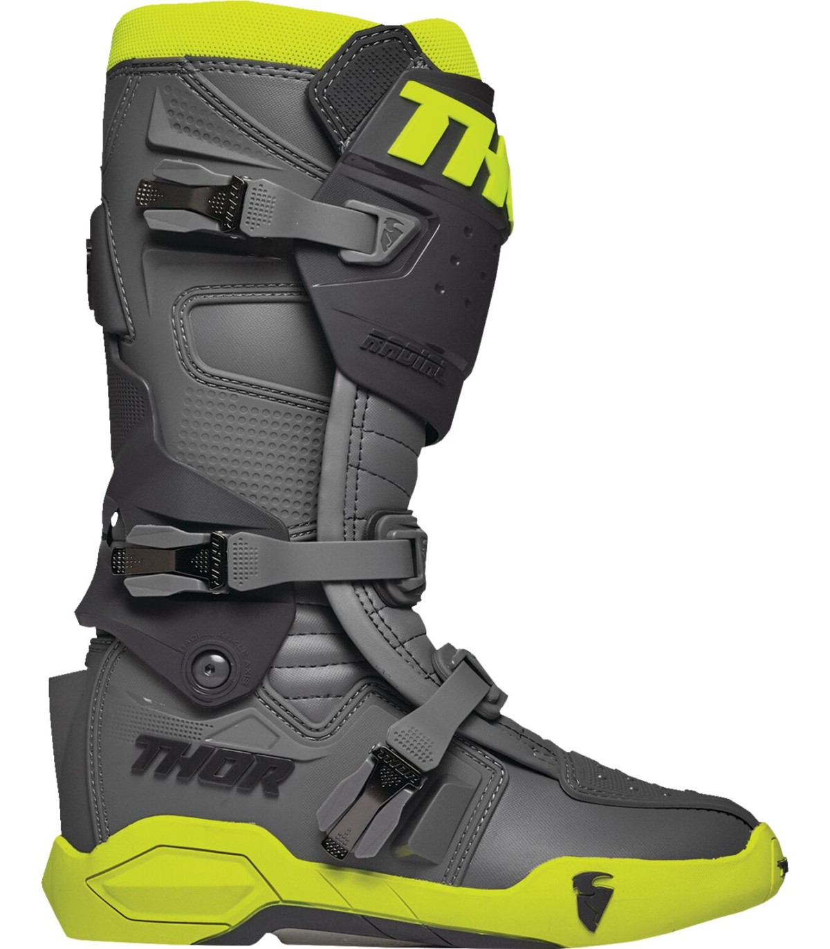 Radial MX BootsPre-curved injection molded components throughoutRadial hinge component adds structure and reduces overextensionInjection-molded positive-lock buckle systemAdjustable straps allow for a custom and secure fitInjection-molded medial-abrasion plate with integrated shift protectionFully synthetic calf overlays deliver premium durability and optimal gripLow-profile toe box for unhindered shiftingUni-directional outsole with steel shank for rigidityReplaceable outsole inserts for extended wearMesh liner promotes airflow while interior EVA panels enhance comfort