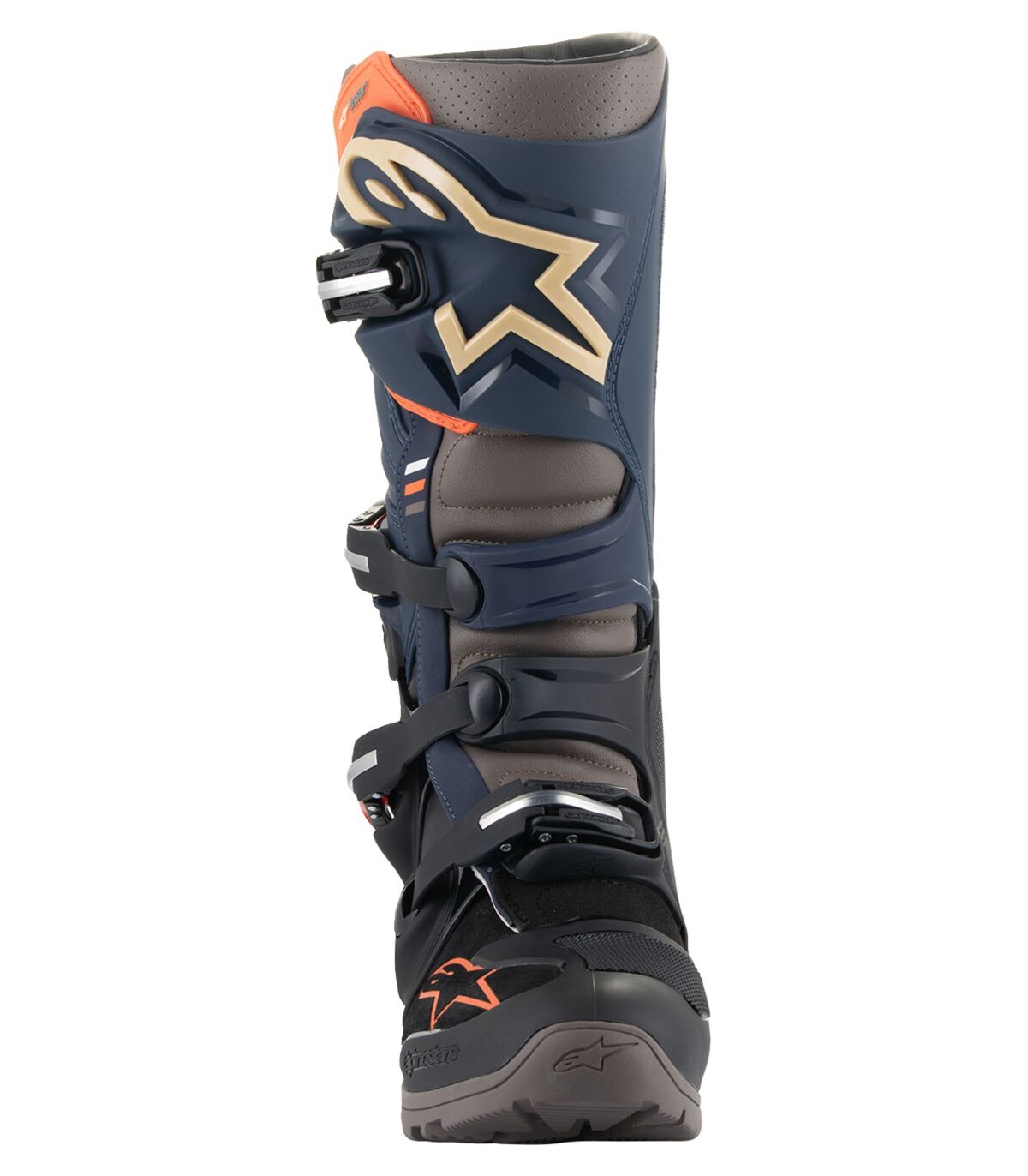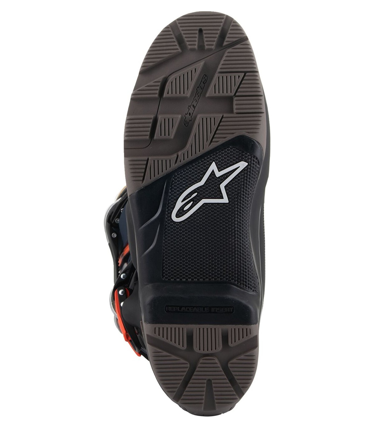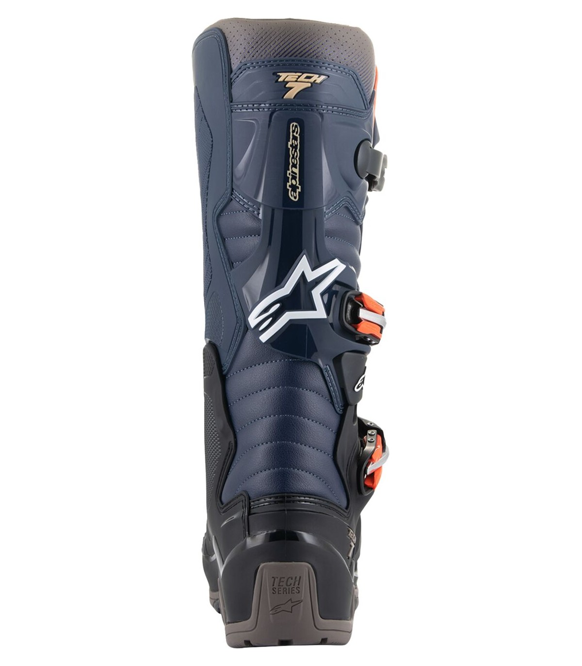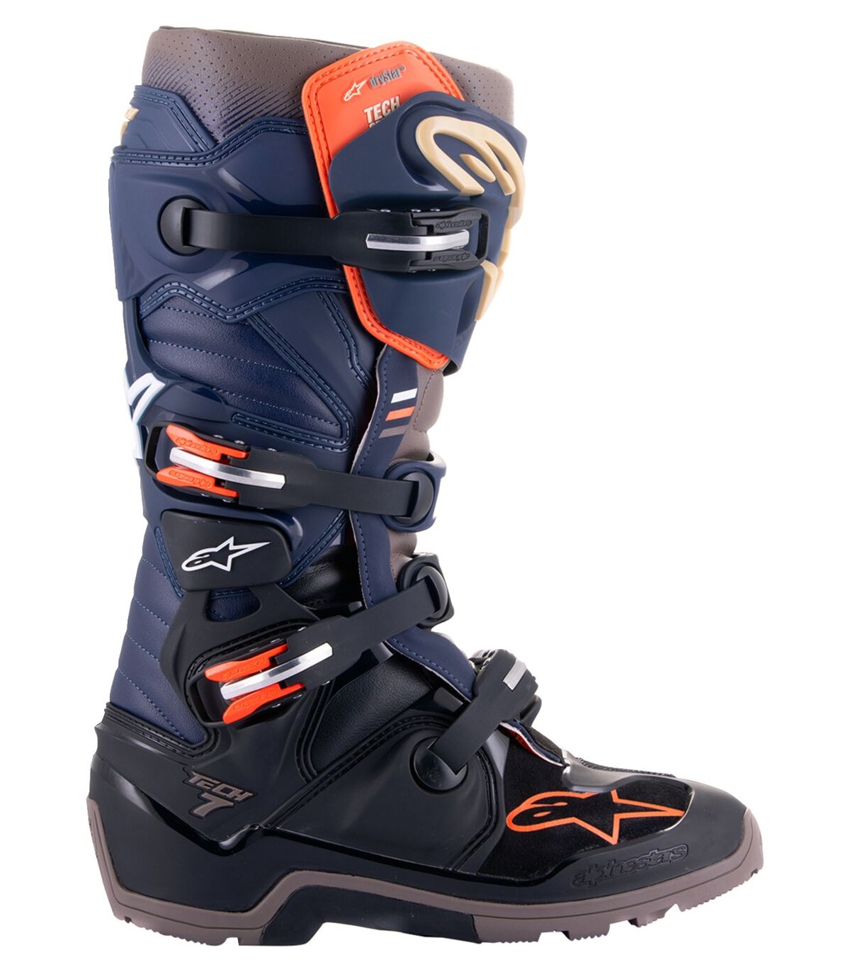 Tech 7 Enduro Drystar® BootsUpper constructed from innovative microfiber material that is flexible and abrasion resistantInnovative, evolutionary TPU shin plate construction for a greater range of fitmentShin plate features a reinforced hook-and-loop closure for a comfortable, customized fitShin zone incorporates a TPU blade system engineered to prevent frontal hyper-extension and offer greater flex controlSpecially designed sole provides enduro riders with superior grip, durability, feel and a high level of structural rigidityWide entry aperture for convenience with a hook-and-loop upper closure with TPU flap to allow a wide range of calf fitment adjustment and supportMedial-facing area is constructed from one-piece TPU panel with a honeycomb structure for maximum grip contact with the bike and improved heat and abrasion resistanceTop rear flexion of the boot is supported around the calf by an innovative TPU sliding blade system which dissipates the frictionErgonomic buckle system offers a secure and highly personalized fitInnovative TPU lateral ankle protection provides a biomechanical link between the middle lateral and the bottom lateral of the bootInstep and Achilles accordion flex zones constructed for superior control and supportTPU lower shell is reinforced with a metal shank and includes toe reinforcement for impact and abrasion resistanceExtended microfiber gaiter helps seal out water and dirtClosure system includes polymer buckles plus an aluminum frame with innovative, self-aligning quick-release closures for a custom, secure fitAll buckles are replaceableBreathable mesh 3D liner with anti-sliding microfiber suede reinforcement on the heel areaSoft poly-foam surrounds the ankles and collar to offer comfort and shock-absorbing performanceRemovable anatomic footbedExclusive high-grip rubber dual-density compound outer soleSole is replaceableTech 7 Enduro Drystar® boot membrane provides 100% protection against water penetration