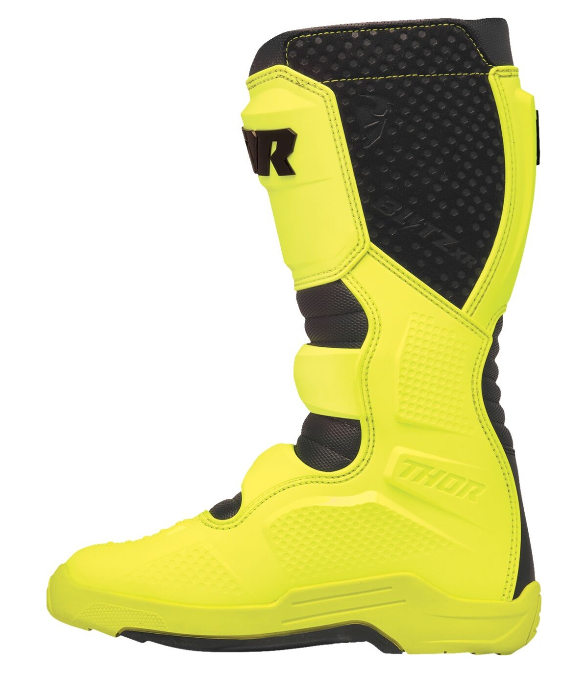 Blitz XR BootsPadded mesh interior improves breathabilityInjection molded medial abrasion plate with integrated shift protectionFully synthetic calf overlays deliver durability and optimal gripInjection molded outsole with a steel shank insert3 fully adjustable straps allow for a custom rider specific fitPre-curved injection molded shin plateTested and certified according to standard EN 13634:2017Injection molded positive lock buckles