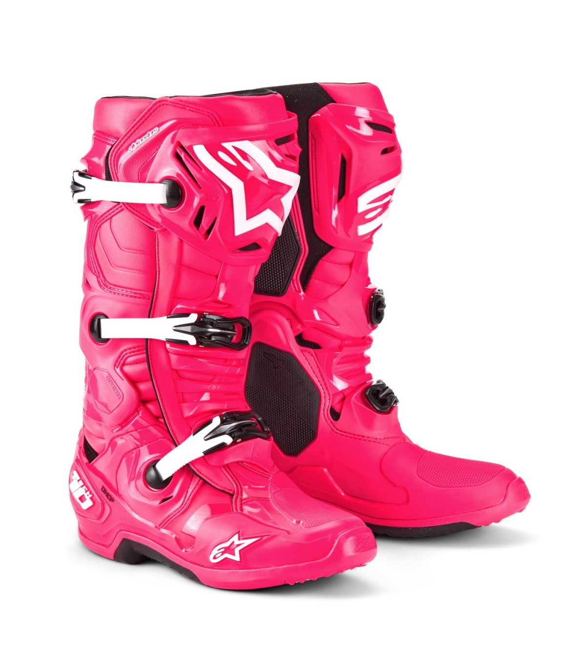 Limited Edition Diva Tech 10 BootsCombines dual front and rear blade connectorsProvides a complete and seamless flexion control system, from the foot shell all the way up to the shin plateEngineered to 'float' freely between the lower and upper boot constructionAsymmetrical, dual pivot arms on boot frameRedesigned dual density Thermoplastic Polyurethane (TPU) rear blade system engineered to prevent hyper-extension while offering improved flex control and impact resistanceDynamic Heel Compression Protector (DHCP), an innovative safety feature which includes a fully integrated collapsible heel area with expanded poly-foam to absorb high impact energies during a crashFeatures lighter, anatomically redesigned medial and lateral torsion armsDouble pivot system allows the Tech 10 to retain its integrity while flexingLow-profile, pull-on design for reduce material build, less weight and to facilitate easier and quicker wearingInnovative flexion inserts work seamlessly with new flex support system for ultimate in performanceTPU protection and shock absorbing padding on the heel and anklesConstructed from a dual density compound and combined with the rear blade systemEnergy dissipating shin plate features a new anatomic design for reduced surface area and weight-savingCompletely redesigned sole with proprietary grip sculpturing to improve foot-peg performance, grip and mud and water run-offExclusive dual-compound sole is seamlessly integrated to the multi-density foot base structure with built-in supportSlim-line buckles include high-impact bridge closures which are cold forged for precision and strengthClosure system features contra-closure, doubling closure security and a quick release/locking system with self-aligning, memory, design for easy, precise closure and improved riding performance and securitySoles and buckles are easily replaceableChassis combines advanced lightweight microfiber and impact and abrasion resistant TPU shellFoot shell features five different compounds in a single lightweight piece to offer strength while maintaining flexibility and structural integritySoft microfiber gaiter helps seal out excessive water and dirt entryPoly-fabric lining with 3D open cell foam incorporates anti-slip suede in heel area, keeping the foot located inside the boot