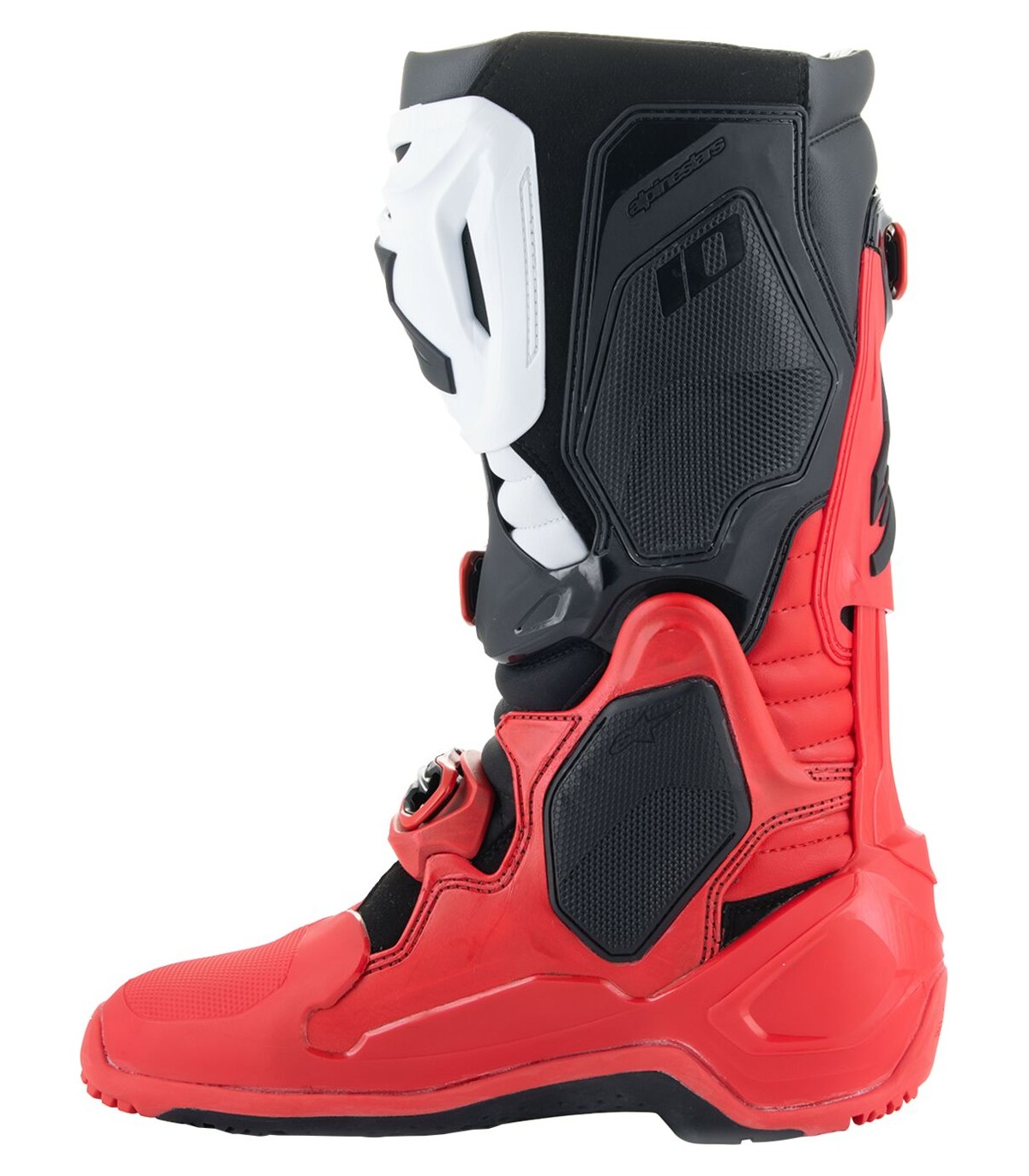 Tech 10 Enduro BootsFeatures its own dedicated 'Enduro' spec dual compound sole that is seamlessly integrated to the multi-density foot base structure with built-in support to offer superior durability, grip and feel while riding, and enhanced performance on the shifterDesign improves overall functionality; performance and safety, while decreasing weight and reducing material volumeFeatures patented Frontal Flexion Control FrameCombining dual front and the rear blade connectors, the frame acts as a shock absorber by distributing energy across boot frame while controlling forward and rearward flex, gives a complete and seamless flexion control system, from the footshell all the way up to the shin plate, offering high performance double motion control, preventing over-compression and hyper-extensionEquipped with Alpinestars ankle control system, which is integrated in the outer shell to allow natural ankle movement, vertical compression control and improved flex control and impact resistanceInner ankle brace and the unique heel protection innovation, patented Dynamic Heel Compression Protector (DCHP), significantly reduces the effect of excessive, potentially injury-causing, energy being transferred to the ankle and lower legFrontal Flex Frame, a complete and seamless flexion control system, from foot shell all the way up to the shin plate, offering high-performance double motion control to prevent over-compression and hyper-extensionDual compound removable anatomic footbedEasier to operate, more secure mechanism on the triple buckle closure systemThermoplastic Polyurethane (TPU) lower shell features an innovative design on the shifter area, with a dedicated design for the left and right footLightweight microfiber upper features extensive TPU protection on the toes, foot, heel, ankle, calf, and shin with extra hard compounds on the toe-box, heel for additional impact and abrasion resistanceEquipped with a poly-fabric lining with 3D open cell foam and anti-sliding suede reinforcement on the heel area for enhanced abrasion resistanceCo-injected for strength and to maintain the boot's structure, exclusive TPU and rubber compound panels provide superb levels of grip contact, durability, and heat resistanceShin plate area is equipped with strategically positioned ventilation windows for superior airflow and ventilation without compromising impact protectionSoft microfiber gaiter features a dedicated design especially for the back of the boots that effectively seals out excessive water and dirt entryDual closure system with an internal microfiber flap, plus hook and loop fasteners, for a precise fit closureClosure system includes lightweight polymer buckles plus an aluminum frame with self-aligning, quick release closures for a customized secure fitmentPull flap is engineered to offer increased prehensility