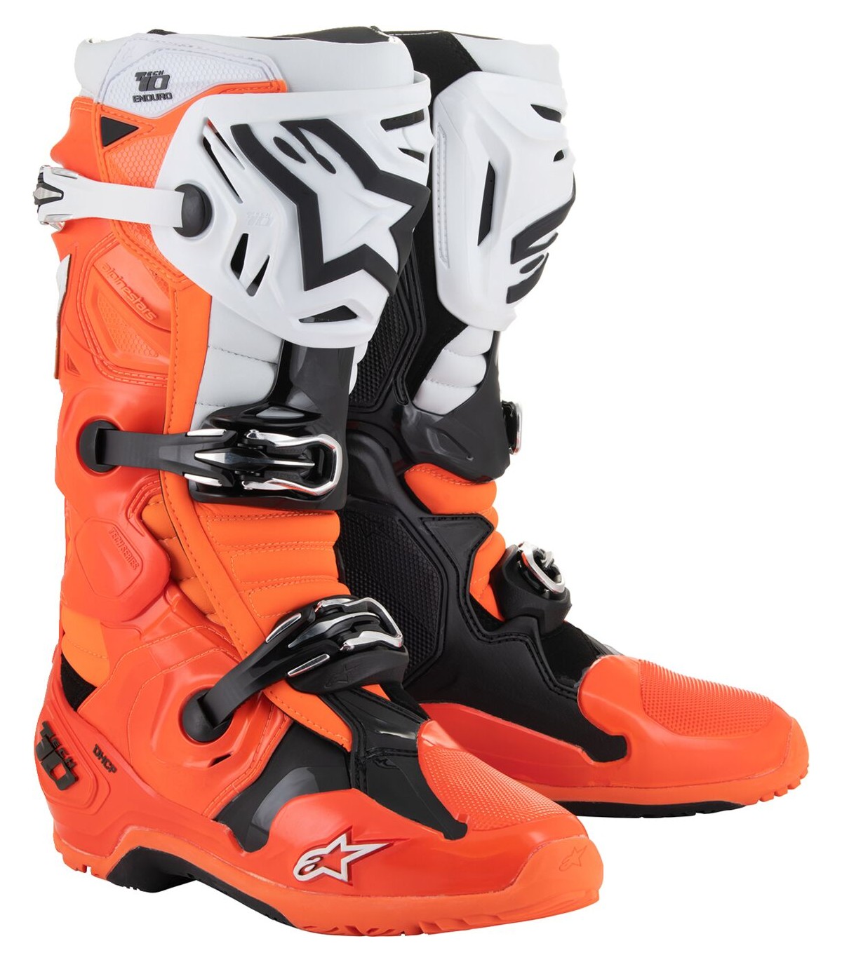 Tech 10 Enduro BootsFeatures its own dedicated 'Enduro' spec dual compound sole that is seamlessly integrated to the multi-density foot base structure with built-in support to offer superior durability, grip and feel while riding, and enhanced performance on the shifterDesign improves overall functionality; performance and safety, while decreasing weight and reducing material volumeFeatures patented Frontal Flexion Control FrameCombining dual front and the rear blade connectors, the frame acts as a shock absorber by distributing energy across boot frame while controlling forward and rearward flex, gives a complete and seamless flexion control system, from the footshell all the way up to the shin plate, offering high performance double motion control, preventing over-compression and hyper-extensionEquipped with Alpinestars ankle control system, which is integrated in the outer shell to allow natural ankle movement, vertical compression control and improved flex control and impact resistanceInner ankle brace and the unique heel protection innovation, patented Dynamic Heel Compression Protector (DCHP), significantly reduces the effect of excessive, potentially injury-causing, energy being transferred to the ankle and lower legFrontal Flex Frame, a complete and seamless flexion control system, from foot shell all the way up to the shin plate, offering high-performance double motion control to prevent over-compression and hyper-extensionDual compound removable anatomic footbedEasier to operate, more secure mechanism on the triple buckle closure systemThermoplastic Polyurethane (TPU) lower shell features an innovative design on the shifter area, with a dedicated design for the left and right footLightweight microfiber upper features extensive TPU protection on the toes, foot, heel, ankle, calf, and shin with extra hard compounds on the toe-box, heel for additional impact and abrasion resistanceEquipped with a poly-fabric lining with 3D open cell foam and anti-sliding suede reinforcement on the heel area for enhanced abrasion resistanceCo-injected for strength and to maintain the boot's structure, exclusive TPU and rubber compound panels provide superb levels of grip contact, durability, and heat resistanceShin plate area is equipped with strategically positioned ventilation windows for superior airflow and ventilation without compromising impact protectionSoft microfiber gaiter features a dedicated design especially for the back of the boots that effectively seals out excessive water and dirt entryDual closure system with an internal microfiber flap, plus hook and loop fasteners, for a precise fit closureClosure system includes lightweight polymer buckles plus an aluminum frame with self-aligning, quick release closures for a customized secure fitmentPull flap is engineered to offer increased prehensility