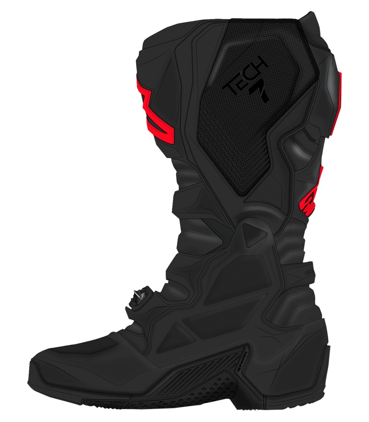 Tech 7 BootsTech 7 has been completely overhauled to ensure exceptional off-road performance in the dirtEngineered to be lighter, more comfortable and more protective than ever to deliver exceptional feel on the bikeThermoplastic Polyurethane (TPU) lower shell features an innovative design on the shifter area for reduced front roll and easy shift lever control, with a dedicated design for the left and right footFurther strengthened with a metal shank and is reinforced on the toe zone for impact and abrasion resistanceEquipped with a medial and lateral double pivot system for improved levels of flexibility and precision controlDedicated design on medial side wall for improving feel, support, and grip on the bike, while increasing protection and durability of the bootContoured TPU calf protector plate offers effective impact resistanceMain flexion of the boot is supported around the medial and lateral ankle by a low profile pivot system for superior freedom of movement and rider comfortFront flexion zone features innovative shock absorbing inserts in the front bellow zone for progressive supportShock absorbing padding is also strategically positioned on the ankles and shin plate for increased impact absorptionStrap holder design offers maximum rotation and functionality, while reducing excessive rotationSole is made with an innovative wear limit indicator embedded in the foot peg area, this layer displays a red layer alerting the rider when the sole is worn out and needs replacingBoot structure beneath wear limit indicator is surrounded by a Kevlar® layer that maintains structure and integrity of the boot while also protecting itClosure system includes polymer buckles plus an aluminum frame with self-aligning, quick release closures for a customized secure fitmentBuckle receiver is engineered to be self-aligning, guaranteeing a secure fit while preventing strap rotationSoft microfiber gaiter features a dedicated design especially for back of the boot that effectively seals out excessive water and dirt entryExtended medial panel is constructed from TPU and its new design incorporates an enlarged rubber insert for maximum grip contact with bike and improved heat and abrasion resistancePull flap is engineered to offer increased prehensilityUpdated and compact TPU shin plate construction for greater range of fitment, equipped with a reinforced hook and loop closure for a comfortable, highly customized fitUpper features extensive TPU protection on toes, foot, heel, ankle, calf, and shin with extra hard compounds on toe-box and heel for additional impact and abrasion resistanceUpper suede leather with a lightweight microfiber construction for superior impact and abrasion resistanceAdditional TPU rear bridge for protecting the Achilles tendonsEquipped with a poly-fabric lining with 3D open cell foam and anti-sliding suede reinforcement on the heel area for enhanced abrasion resistanceOne-piece sole is constructed from a highly durable, dual compound vulcanized rubber for durability and protectionSole is replaceable