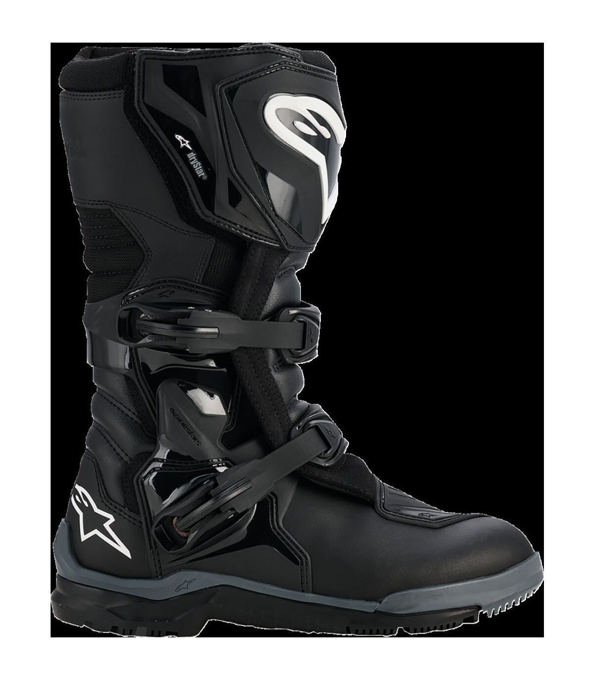 Corozal Adventure Drystar® BootsBlack boot upper is made from Polyurethane (PU)-coated leather with a high suede leather medial panel for superior gripFront and rear boot bellows make with lightweight microfiber for increased durability and abrasion resistanceRear reflective insert for improved visibilityExtended PU-coated front leather gaiter helps keep out water and dirtRear gaiter has rubber insert for flexibility and comfortThermoplastic Polyurethane (TPU) shin and calf plate offer support and resistance to impactsBio-mechanical lateral flexi-blade boot system provides excellent front and rear movement while offering support and protection to the ankleTPU shift pad is made with a technical texture for added grip; foam padding on bottom of the shift pad provides better comfortWide entry aperture for convenience with hook-and-loop upper closure flap that allows a wide range of adjustment for an excellent fitTPU double-density ankle protector on medial side for protectionBoot closure system includes two polymer ratchet buckles with memory feature and quick-release locking system that is self-aligning for easy, precise closureAll boot buckles are replaceableSoft foam surrounds the ankles and collar for comfort and shock-absorbing performanceDrystar® membrane layer between boot upper liningToe box and heel counter reinforcements layered under the boot upperReplaceable anatomical Ethylene-Vinyl Acetate (EVA) footbed with Lycra® lining on topPolypropylene (PP) insole with steel shank is co-injected for excellent feel and safetyVulcanized rubber compound for optimal comfort and grip56% Cow Leather, 24% TPU, 13% Microfiber & 7% TPR. Inner/linning: 100% Polyester