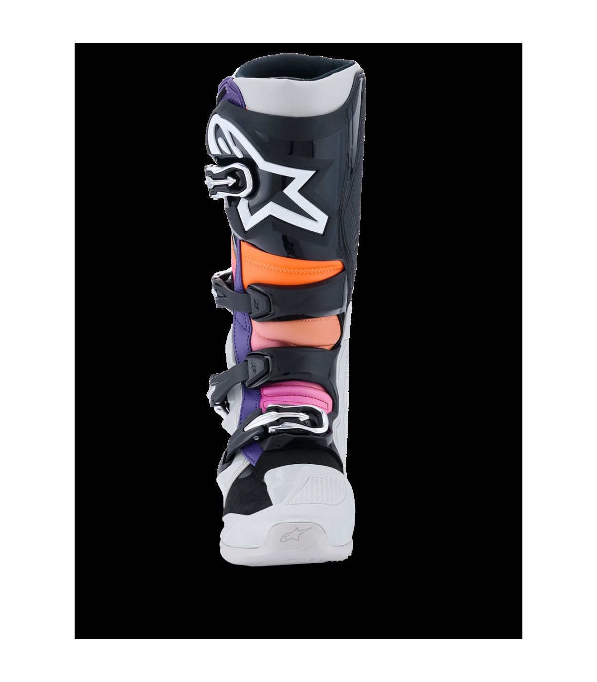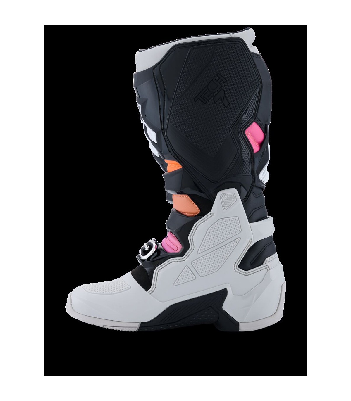Tech 7 BootsTech 7 has been completely overhauled to ensure exceptional off-road performance in the dirtEngineered to be lighter, more comfortable and more protective than ever to deliver exceptional feel on the bikeThermoplastic Polyurethane (TPU) lower shell features an innovative design on the shifter area for reduced front roll and easy shift lever control, with a dedicated design for the left and right footFurther strengthened with a metal shank and is reinforced on the toe zone for impact and abrasion resistanceEquipped with a medial and lateral double pivot system for improved levels of flexibility and precision controlDedicated design on medial side wall for improving feel, support, and grip on the bike, while increasing protection and durability of the bootContoured TPU calf protector plate offers effective impact resistanceMain flexion of the boot is supported around the medial and lateral ankle by a low profile pivot system for superior freedom of movement and rider comfortFront flexion zone features innovative shock absorbing inserts in the front bellow zone for progressive supportShock absorbing padding is also strategically positioned on the ankles and shin plate for increased impact absorptionStrap holder design offers maximum rotation and functionality, while reducing excessive rotationSole is made with an innovative wear limit indicator embedded in the foot peg area, this layer displays a red layer alerting the rider when the sole is worn out and needs replacingBoot structure beneath wear limit indicator is surrounded by a Kevlar® layer that maintains structure and integrity of the boot while also protecting itClosure system includes polymer buckles plus an aluminum frame with self-aligning, quick release closures for a customized secure fitmentBuckle receiver is engineered to be self-aligning, guaranteeing a secure fit while preventing strap rotationSoft microfiber gaiter features a dedicated design especially for back of the boot that effectively seals out excessive water and dirt entryExtended medial panel is constructed from TPU and its new design incorporates an enlarged rubber insert for maximum grip contact with bike and improved heat and abrasion resistancePull flap is engineered to offer increased prehensilityUpdated and compact TPU shin plate construction for greater range of fitment, equipped with a reinforced hook and loop closure for a comfortable, highly customized fitUpper features extensive TPU protection on toes, foot, heel, ankle, calf, and shin with extra hard compounds on toe-box and heel for additional impact and abrasion resistanceUpper suede leather with a lightweight microfiber construction for superior impact and abrasion resistanceAdditional TPU rear bridge for protecting the Achilles tendonsEquipped with a poly-fabric lining with 3D open cell foam and anti-sliding suede reinforcement on the heel area for enhanced abrasion resistanceOne-piece sole is constructed from a highly durable, dual compound vulcanized rubber for durability and protectionSole is replaceable52% TPU, 32% Microfiber, 10% Rubber, 4% TPR, 1% Cow Leather & 1% Microfiber Suede. Inner/lining: 87% Polyester, 8% Microfiber Suede & 5% Synthetic