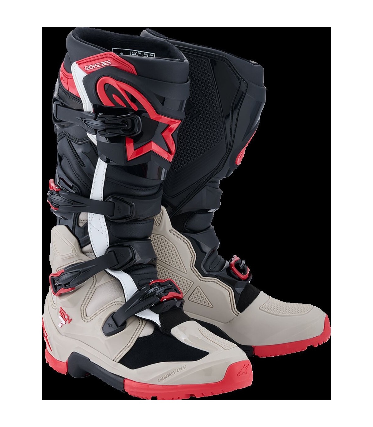 Tech 7 Enduro BootsUpper is constructed from light, innovative microfiber that is flexible and abrasion resistantInnovative, evolutionary Thermoplastic Polyurethane (TPU) shin plate construction for a greater range of fitmentShin plate features a reinforced hook-and-loop closure for a comfortable, customized fitShin zone incorporates a TPU blade system engineered to prevent frontal hyper-extension and offer greater flex controlSpecially designed sole provides enduro riders with superior grip, durability, feel and a high level of structural rigidityWide entry aperture for convenience with a hook-and-loop upper closure with TPU flap to allow a wide range of calf fitment adjustment and supportMedial-facing area is constructed from one-piece TPU panel with a honeycomb structure for maximum grip contact with the bike and improved heat and abrasion resistanceTop rear flexion of the boot is supported around the calf by an innovative TPU sliding blade system which dissipates the frictionErgonomic buckle system offers a secure and highly personalized fitInnovative TPU lateral ankle protection provides a bio-mechanical link between the middle lateral and the bottom lateral of the bootInstep and Achilles accordion flex zones constructed for superior control and supportTPU lower shell is reinforced with a metal shank and includes toe reinforcement for impact and abrasion resistanceExtended microfiber gaiter helps seal out water and dirtClosure system includes polymer buckles plus an aluminum frame with innovative, self-aligning quick-release closures for a custom, secure fitAll buckles are replaceableBreathable mesh 3D liner with anti-sliding microfiber suede reinforcement on the heel areaSoft poly-foam surrounds the ankles and collar to offer comfort and shock-absorbing performanceRemovable anatomic footbedExclusive high-grip rubber dual-density compound outer soleSole is replaceable