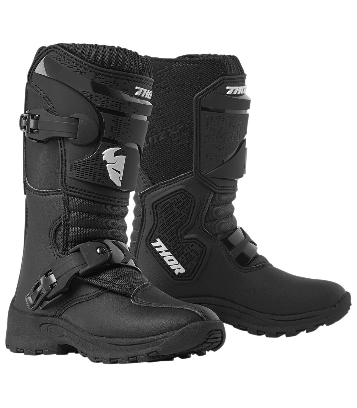 Mini Blitz XP BootsAdjusted boot height and smaller sizing tailors to child ridersPre-curved injection molded shin plate2 fully adjustable straps allow for a custom, rider specific fitFully synthetic calm overlays deliver premium durability and optimal gripUni-directional outsole with steel shank insertInjection molded positive lock bucklesMesh liner promotes airflow