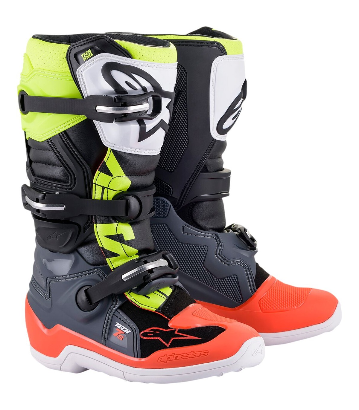 Youth Tech 7S BootsSpecifically designed and sized for junior and/or smaller framed ridersPolyurethane (PU)-reinforced microfiber upper for flexibility, abrasion-resistance, water-resistance and weight-savingMaterial ensures consistent fit and is easy to maintain and cleanContoured shin plate is injected with high-modulus Thermoplastic Polyurethane (TPU) for excellent levels of impact- and abrasion-resistanceMedial facing side incorporates TPU panel with specially designed sculpturing for maximum grip contact with bike and improved heat- and abrasion-resistanceOne-piece injected dual compound foot shell with co-injected hard toe protector and integrated steel shankShell is highly resistant to abrasion and impact, adds to the boot’s overall durability and improves boot’s streamliningExcellent flexion provided by low-profile medial and lateral pivot system to offer movement and supportInstep and Achilles accordion flex zones constructed for superior control and supportExtended microfiber gaiter helps seal out excessive water and dirt entryCompound sole is seamlessly integrated into the base structure for superior durability, high-performing rubber grip patterning, and feelSole is replaceableSoft poly foam reinforcement on ankles and collar for long-lasting comfort and shock absorptionRemovable anatomic footbed for comfort and support ensures even weight distribution3D mesh textile with open cell foam for improved air circulation and comfortBuckle closure system incorporates polymer and fiberglass buckle arms and high-impact aluminum bridge closures for durability and weight-savingBuckle system features memory and a quick release/locking system with self-aligning design for easy, precise closure and improved riding performance and securityAll buckles are easily replaceable