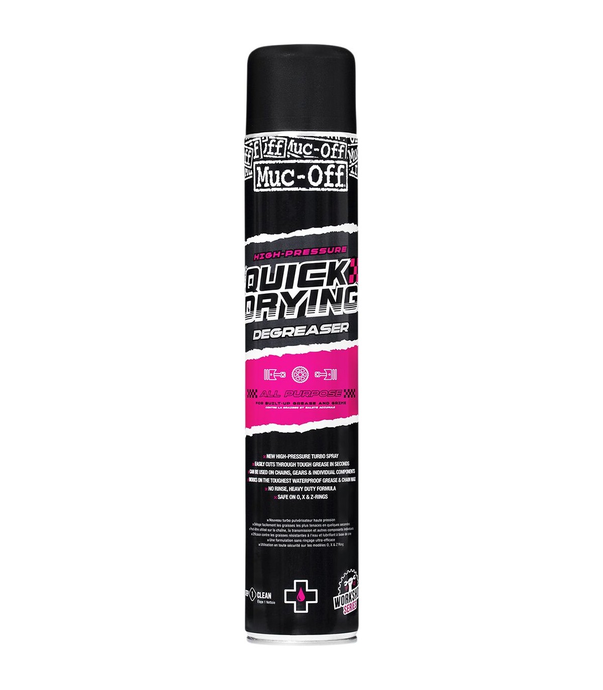 Quick Drying DegreaserNew high-pressure turbo sprayEasily cuts through tough grease in secondsNo rinse, heavy duty formulaCan be used on chains, gears, mechs and individual componentsWorks on the toughest waterproof grease and chain waxSafe on O, X and Z-rings