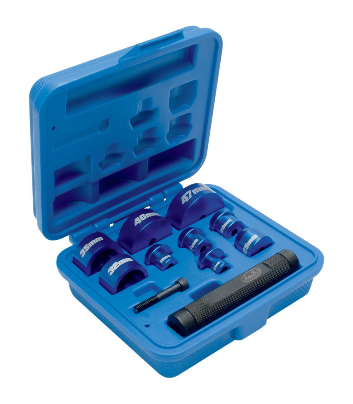 Bearing Driver SetAdapters can be changed quickly to accommodate a wide range of bearing combinationsFits bearing with 12 mm - 25 mm inner diameter and 32 mm - 47 mm outer diameterDurable steel handle and anodized aluminum driversLaser etched adapters for easy identificationCan be used with a hammer or shop pressComes with protective blow-molded case