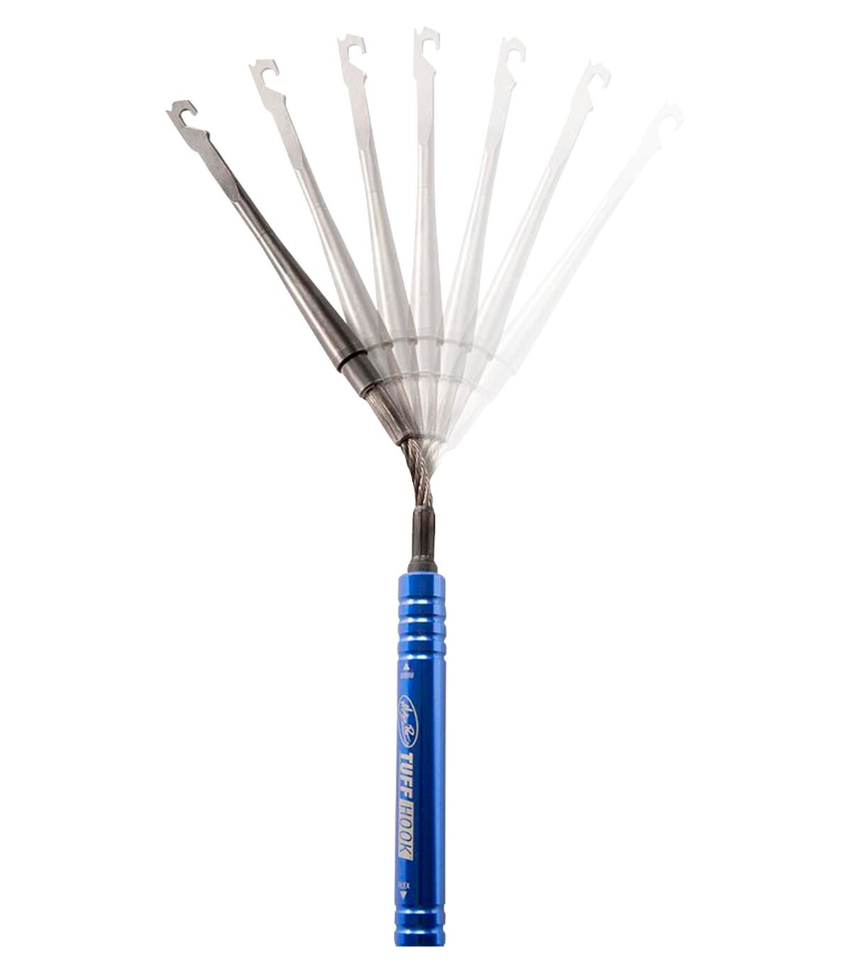 Tuff Hook™Flexing shaft is ideal for hard to reach springs with minimal working spaceMulti-function tip easily pulls or pushes large springs on and off mountsLocking shaft slider allows the center of the shaft to be rigid or flexHeavy-duty design for use on large exhaust and kickstand springsBillet aluminum construction handle and locking shaft sliderSteel shaft with heavy-duty stainless steel flex insert