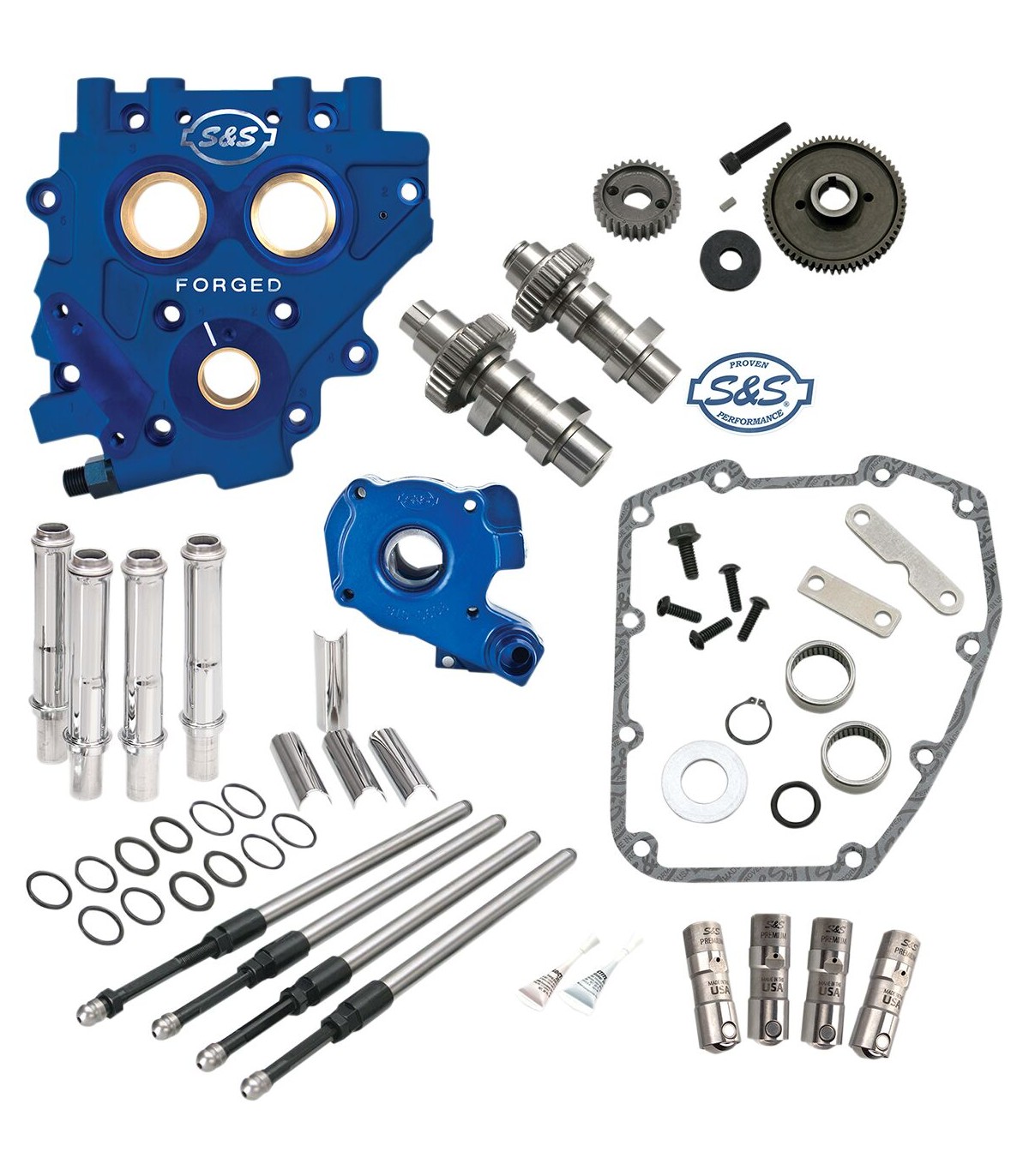 Gear Drive Cam Chest KitUpgrade to S&S bolt-in performance camshaftsImproves engine performance - higher lift and optimized cam timingS&S Quickee pushrods - easy installation, without removing rocker coversReplaces stock oil pump, cam support plate, cams, chain tensioners, and tappets with all-new, premium U.S. made S&S componentsGear-drive kit offers peace of mind - no more worries about cam chain failureMade in the USAFor '07-'17 Twin Cam and '06 Dyna.