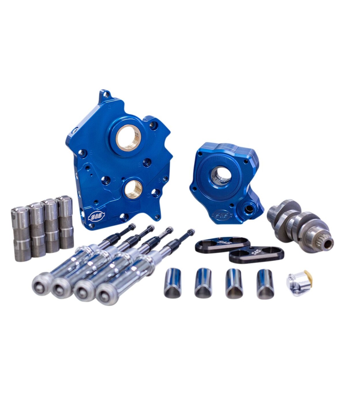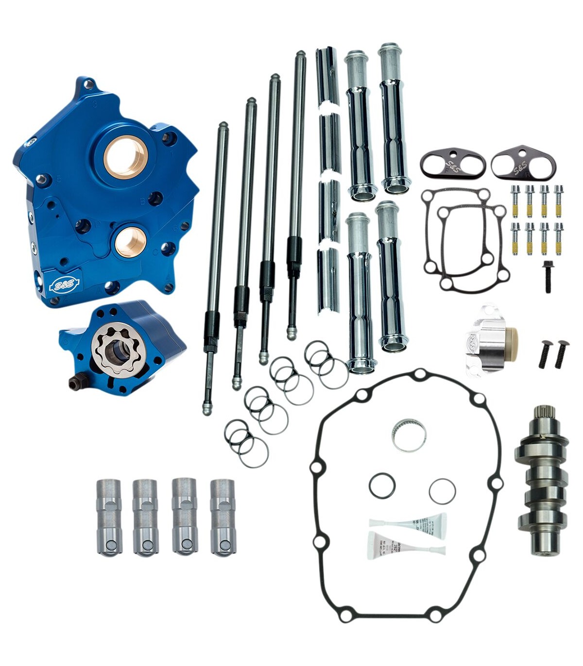 Cam Chest Kit for M8Oil Pump/Cam Plate:Precision machined from billet aluminumBlue anodized finishPassage plugs removable for servicingIndependant scavenge sections for flywheel cavity and cam chestDebris screens in both pickupsMagnet in cam chest to help stop debris from entering oil pumpIncreased flow capacity on both feed and scavenge sideAdjustable pressure relief vale is adjustable with unit installed in engineIncludes S&S high performance cam chain tensionerPushrods:Quickee pushrodsTappets:S&S precision tappetsTappet Cuffs:Hard anodized black coatingBillet aluminum constructionStronger than stock material eliminates distortionImproves tappet stability in high lift and high rpm situationsCam:Includes all gaskets, bearings and hardware for installationMade in the USA475 is a bolt-in 100 horsepower cam.