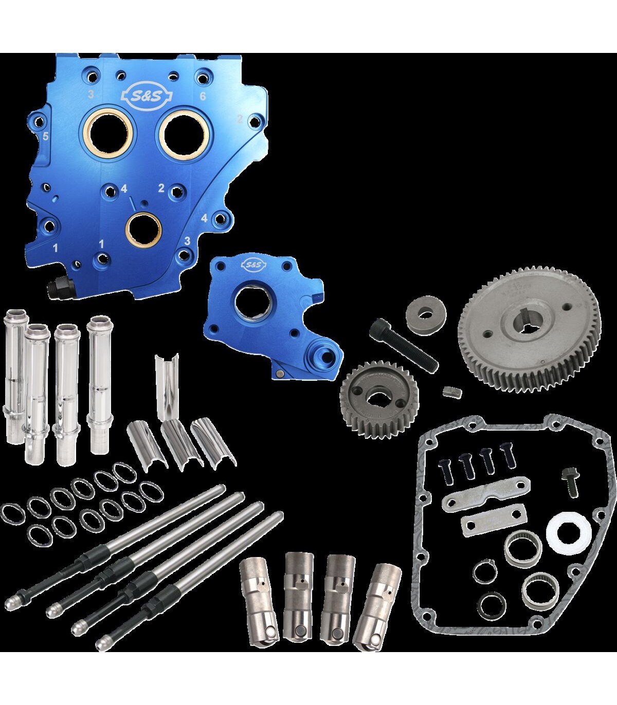 Cam Chest Kit without Cams for Gear Drive Twin CamOil Pump/Cam PlatePrecision machined from billet aluminumPassage plugs are removable for servicingIndependent scavenge sections for flywheel cavity and cam chestDebris screens in both scavenge pickupsMagnet in cam chest side to help stop debris from entering oil pump44% flow increase on supply side and 58% flow increase on scavenge Pressure relief valve is adjustable with unit installed in enginePushrodsQuikee PushrodsTappetsS&S Precision TappetsHand assembled to exacting tolerancesReduced valve train noise from start up to shut downClose tolerances for low leak down ratesFast pump up and high rpm performanceTappet Cuffs:Billet aluminum construction with hard anodized black coatingStronger than stock material eliminates distortion and improves tappet stability in high lift and high rpm situationsKit includes TC3 oil pump and plate, pushrods, tappets and tappet cuffs