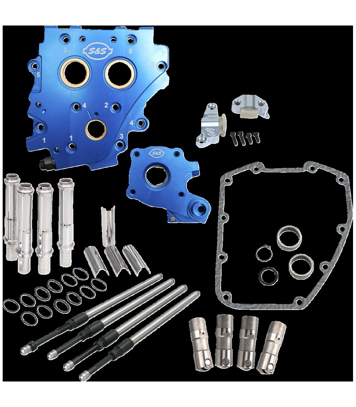 Cam Chest Kit without Cams for Chain Drive Twin CamOil Pump/Cam Plate:Precision machined from billet aluminumPassage plugs are removable for servicingIndependent scavenge sections for flywheel cavity and cam chestDebris screens in both scavenge pickupsMagnet in cam chest side to help stop debris from entering oil pump44% flow increase on supply side and 58% flow increase on scavenge Pressure relief valve is adjustable with unit installed in enginePushrods:Quikee PushrodsTappets:S&S Precision TappetsHand assembled to exacting tolerancesReduced valve train noise from start up to shut downClose tolerances for low leak down ratesFast pump up and high rpm performanceKit Includes: