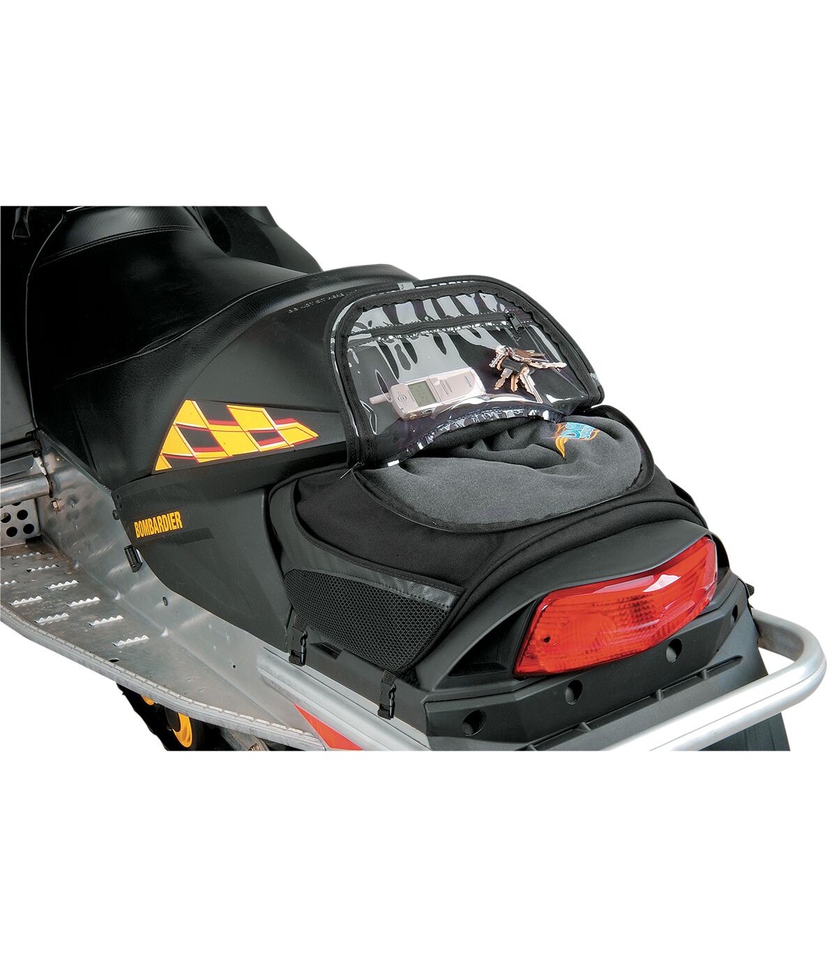 Sacoche de selle arrièreDesign à quatre sangles qui utilise des vis de montage sur le tunnel arrièrePochette interne à fermeture éclair pour les petits objets (portefeuille, clés, etc.)Le tissu à support en mousse permet au sac de conserver sa forme lorsqu'il est videDeux poches sur le côté en filet pour un espace de rangement supplémentairePoignée sur le dessus du sac pour un transport facileLa poignée se double et sert de point de fixation supplémentaire sur les modèles MXZ standardsDisponible uniquement en noir