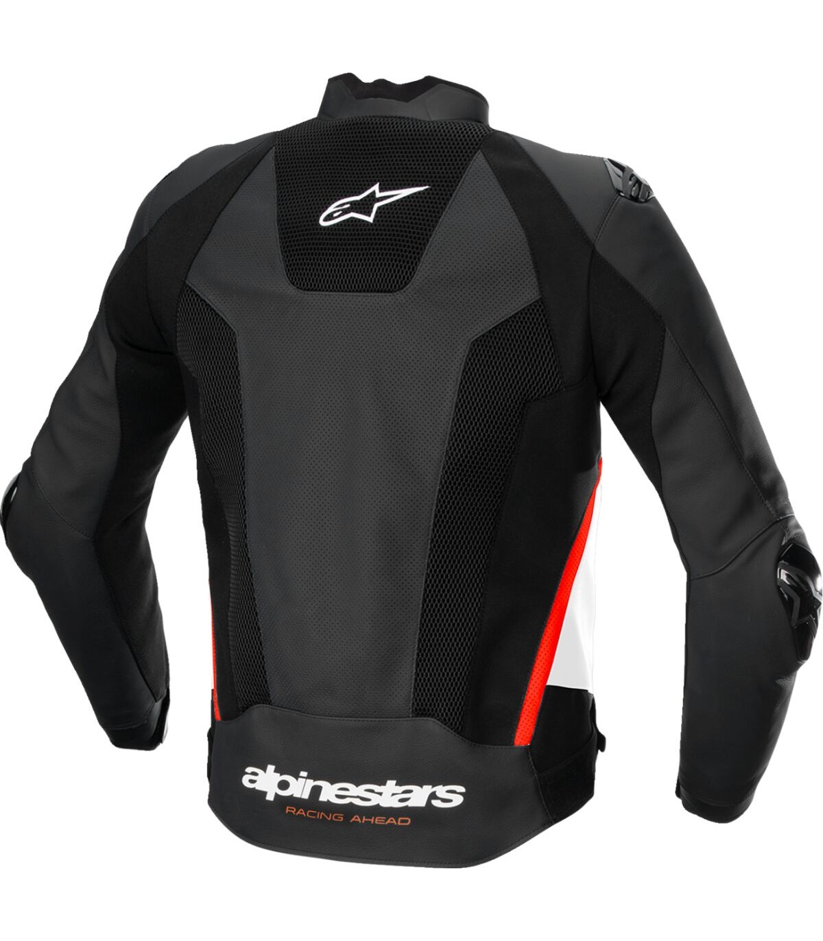 Missile v3 Airflow Leather JacketThe Missile v3 Airflow Leather Jacket is a premium racing sport jacket derived directly from MotoGP, incorporating advanced levels of racing technology to deliver premiumprotection performance, comfort, style, and the ultimate in airflow.The jacket offers leading protective technologies, including seamless DFS, phantom black shadow protectors in TPU on the external shoulders and Alpinestars Nucleon PLASMA Pro Level 2 armor on the shoulders and elbows.Engineered to deliver the highest level of active race protection; the jacket is Tech-Air® Ready and is Tech-Air® Compatible with the new Tech-Air® 7x Airbag System.Extended technical stretch panels on the chest, upper back, inner arms, armpits, and waist areas with PU reinforcements on back panels for optimum riding comfort.Extensive perforations in the leather on the chest, back, forearms and biceps for added ventilation and cooling airflow for improved rider comfort, in warm weather climates.Detachable thermal liner, 80g body/60g sleeves, perfect to riders warm during cooler days at the track or on the road.New seamless collar and wrist hem offers lightweight and enhanced rider comfort.Race fit with pre-curved arms for enhanced performance, premium comfort, and freedom of movement in the riding position.Premium bovine race leather for superior abrasion resistance.Protection:Tech-Air® Ready, and Tech-Air® 7x Compatible.DFS armor delivers optimal resistance against impacts and abrasion, and offers exceptional friction control.Stretch inserts with PU reinforcements for optimal abrasion resistance while ensuring enhanced freedom of movement.Chest and back compartments can accommodate the Nucleon chest and back inserts (available as accessory upgrades).EN17092-3:2020 – AA ClassElbow & shoulder protection Plasma Pro EN 1621-1:2012 Level 2