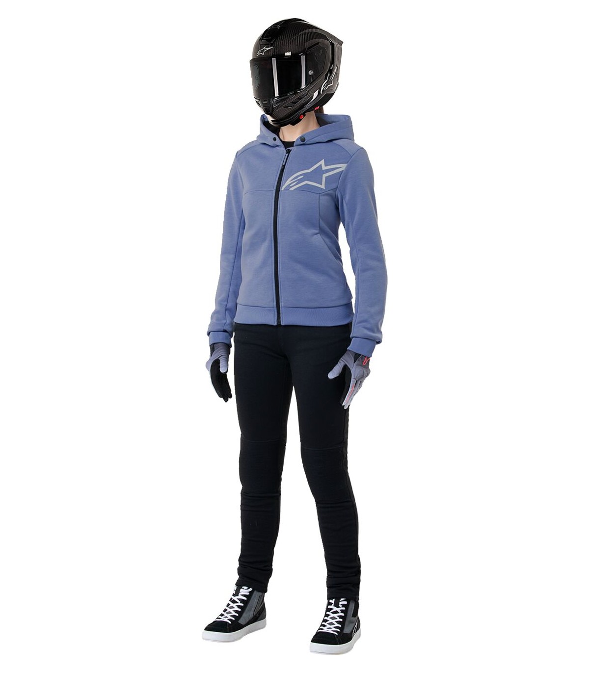 Stella Chrome v2 Sport HoodieOffers excellent abrasion resistance thanks to the aramidic reinforcements on the shoulders and elbows, in a casual package that looks great, on and off the bikeEquipped with Nucleon Flex Plus protectors on the shoulders and elbows for superior impact protectionFeatures an evolved fit designed for a modern athletic silhouette, while still maintaining enhanced levels of comfort and fitOptimized for comfort and freedom of movement without sacrificing style or performanceFeatures a cordless hood with a snap collar button to tighten the hood securely around the neck while riding, providing added protection from the elementsThe back snap hood connection keeps the hood stable when not in use, preventing it from flapping in the wind during a rideTech fleece main construction for the optimum blend of durability, comfort and light weightDual hand pockets with zippered compartments for safe and secure storage of essentialsOne waterproof pocket for added protection against moisture and rainTech-Air® ReadyEN 17092-4:2020