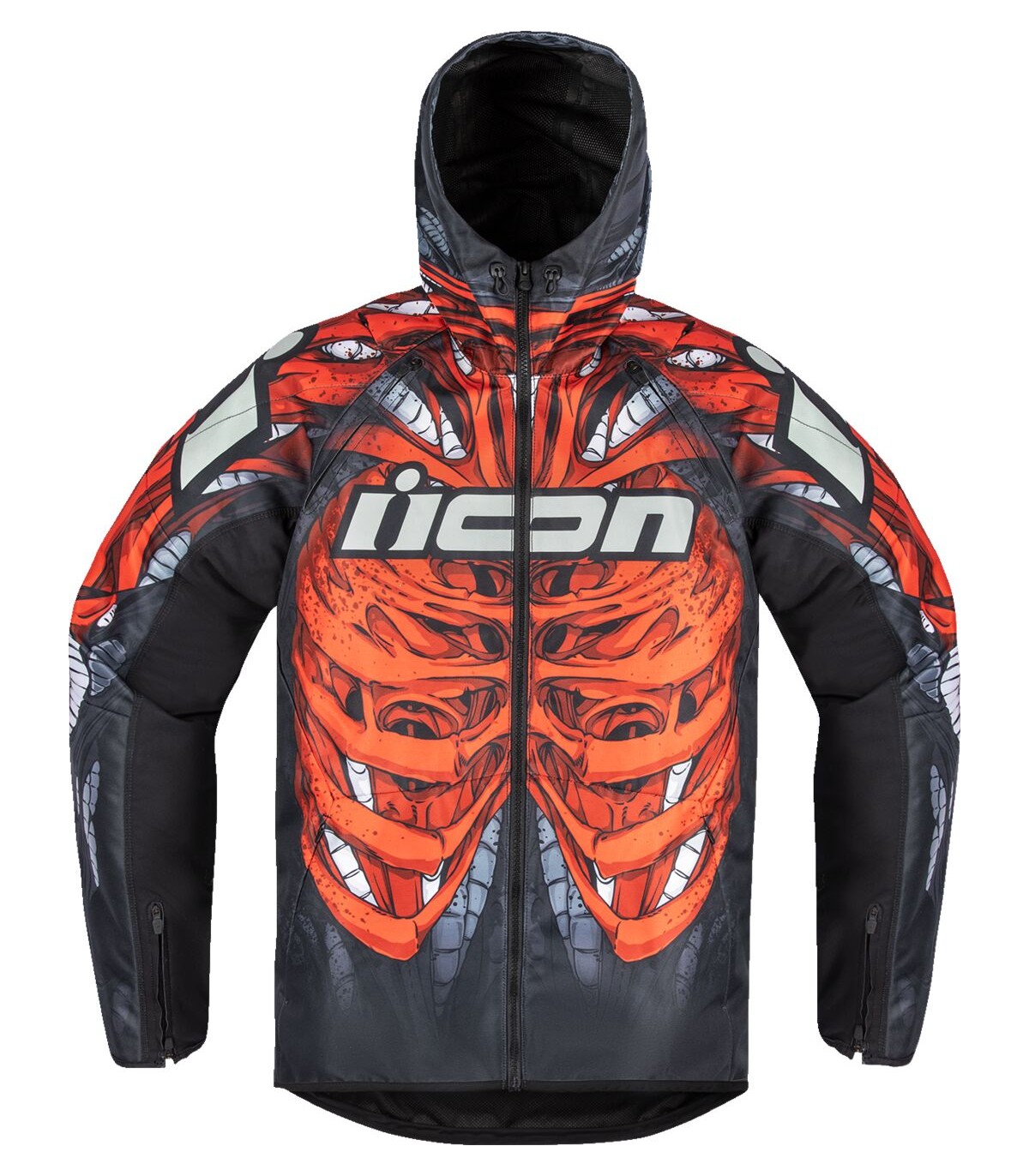 Airform Manik'r™ JacketAirform Manik'r™ graphic on front and back of jacket420D Polyester chassis with 300D Polyester internal reinforcementPU-Coated shell material with DWR finishD30® removable Viper back protector; elbow and shoulder impact protectorsBungee cord style drawstring hoodAirFly™ center front mesh panel with chest and back zippered vents Vented cuff zippersBack protector EN 1621-2 Level 1