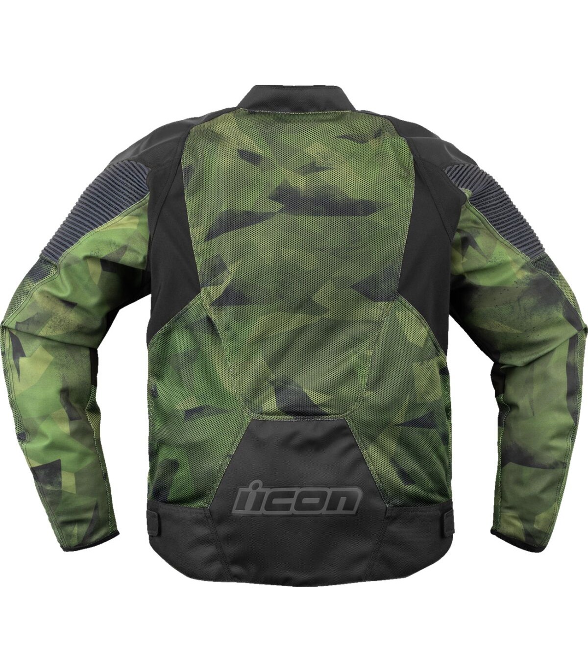 Overlord3 Mesh™ Camo JacketOverlord3 Mesh Camo Jacket constructed of durable 300D Polyester and Iron Weave™ Mesh chassis and sleevesInternal 300D Polyester panels for reinforcement plus D30® impact protectors in the back, elbows, and shouldersOptimum airflow for hot weather ridingIcon® Sport Fit has pre-curved arms and waist adjustersRemoveable insulated vest linerBack protector EN 1621-2 Level 1