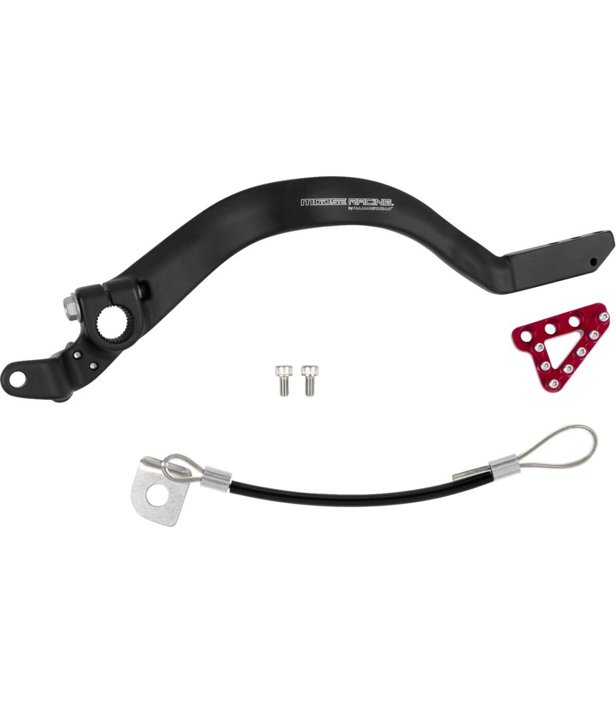 Pédale de freinMoose Racing s'est associé à Hammerhead pour vous offrir la pédale de frein ultimeLes bras de la pédale de frein sont forgés à partir d’aluminium taillé dans la masse 6061 avec axes de chape de frein en acier inoxydable et douilles de pivot en laiton.L'extrémité de frein finement usinée CNC est dotée d'un jeu de vis en acier inoxydable pour améliorer sa durée de vie et son adhérenceLes embouts des pédales de frein peuvent être ajustés dans deux positions de montage dans le sens de la longueur et sont connectés à l'aide de vis 6 pans en acier inoxydableLe bras de pédale de frein anodisé est en noir mat, tandis que les embouts sont anodisés et peints dans des couleurs différentes selon la marque de la motoChaque pédale de frein est dotée d'un câble de maintien en acier inoxydablePièce anodisée et dotée d'une protection UV pour conserver sa couleurFabrication aux États-Unis