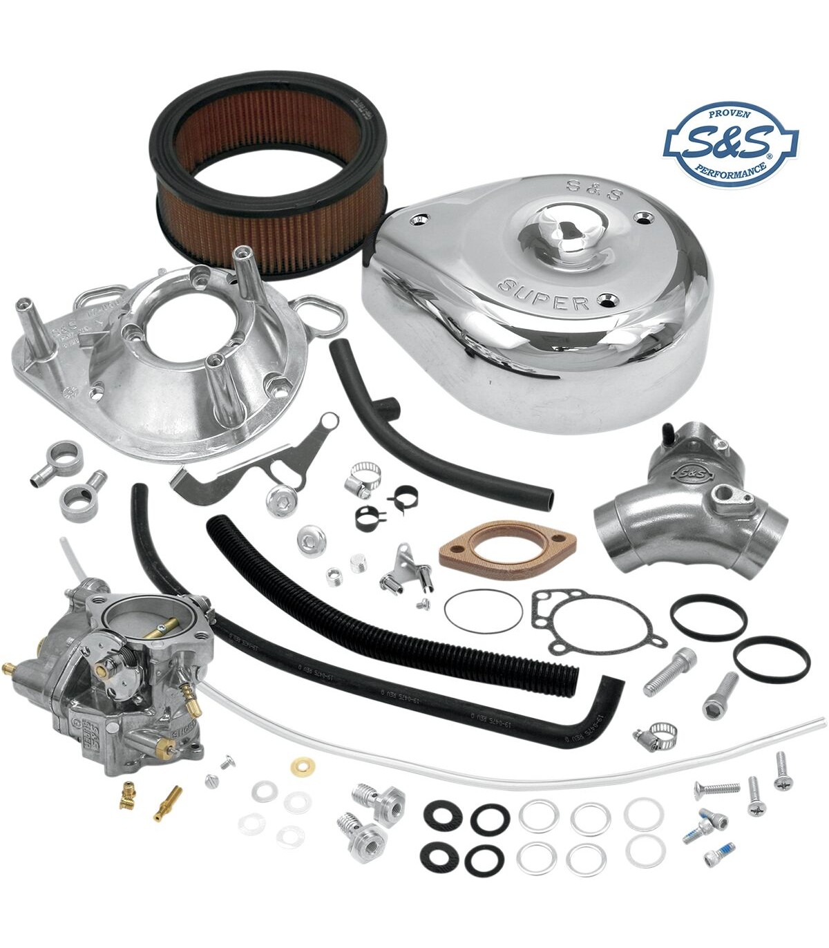 Super G Carburetor KitCarb kit includes a carburetor with updated fuel delivery pots and idle screws, S&S teardrop air cleaner assembly, manifold, mounting hardware, fuel line, clamps overflow line, one extra intermediate jet and two main jets, VOES tubing (when applicable), installation and jetting instructionsCarburetor has a 2.065" throat at the butterfly and a 1.75" venturi and is recommended for use on 90-cubic-inch and larger high-performance and modified enginesS&S Super G carburetors require the use of a two-cable, pull open/pull close throttle assembly.Not recommended for smaller, lower compression enginesMade in the USA