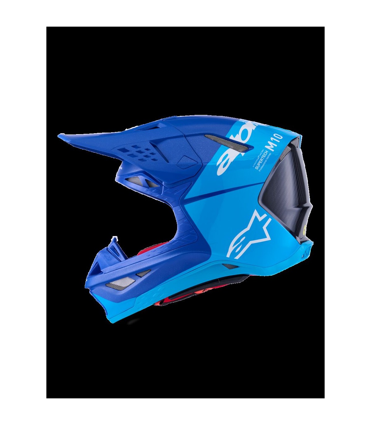 Supertech M10 Flood MIPS® HelmetThe S-M10 shell sizing solution ensures each helmet fit size has its own appropriate shell size to deliver the most anatomical solution for the wide variety of fit needs, thus ensuring riders have the correct fit to improve comfort, reduce overall weight, and improve effectiveness of the helmet in an impact.Surface curvature promotes reduced friction on impact, allowing deflection and transfer of energy to protect the rider's head from direct force to the skull and referred to the neck and spinal column.The S-M10's design offers a smooth, attractive, aerodynamic profile which is streamlined and free of any external channels and features that might act as a load point in an impact or compromise the overall integrity of the helmet's construction.Fitted with E-2, last generation of MIPS, integrated low friction layer designed to reduce rotational motion transferred to the brain from angled impacts to the head.Chin bar's base area specifically sculpted to give a relief section and raised to clear the collarbone.Soft EPS liner extends beyond the helmet shell itself and is covered by a flexible rubber compound providing a reduced chance of any sort of collarbone injury.A-Head Fitment System allows easy adjustment of the angle and height that the helmet sits on the head.Ultra-ventilated helmet with 28 individual intake and exhaust ports, not including the eye port, with 18 intakes and 10 exhausts.Eject technology includes the eject helmet removal system.Rotational acceleration and oblique impact performance.Removable side pads, made from a semi-soft polymer for added protection, provide contact area to help spread impact energy.Emergency Release System (ERS) Emergency Visor Release and Visor Extension provides protection.40% Carbon-Kevlar®-Fiberglass, 15% Polystyrene (EPS), 12% Polyurethane, 10% Polypropylene, 8% PVC, 4% Acrylonitrile-Butadiene-Styren, 4% Polyamide, 2% Steel & 5% Other