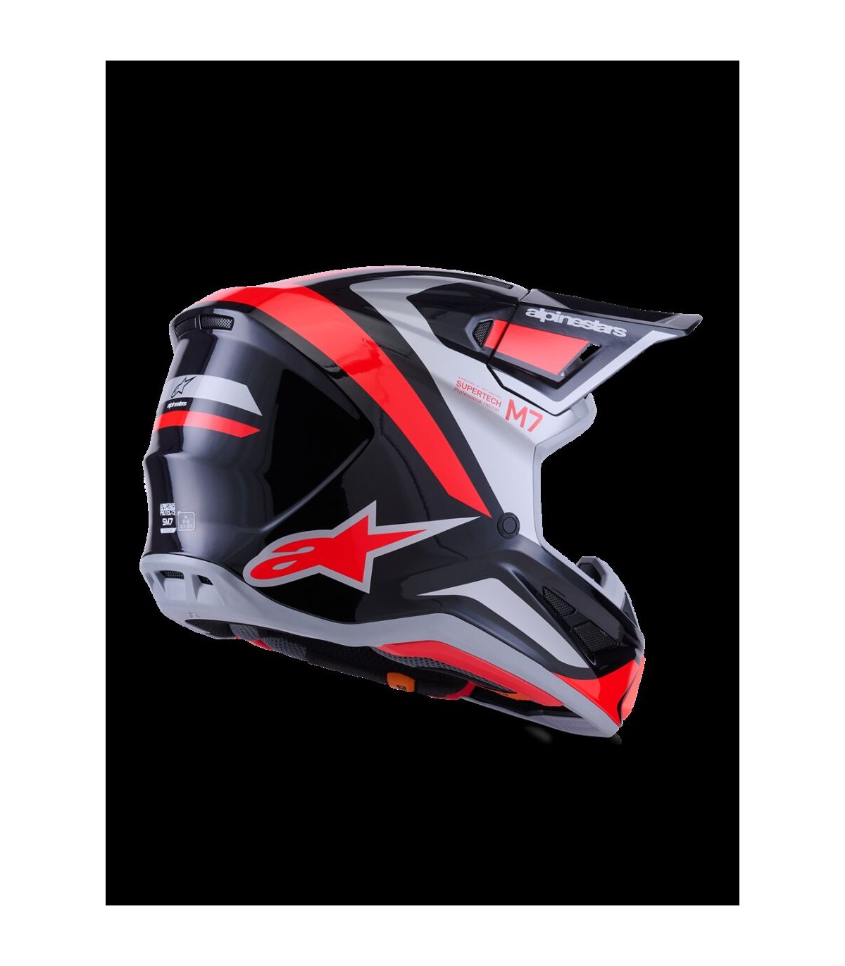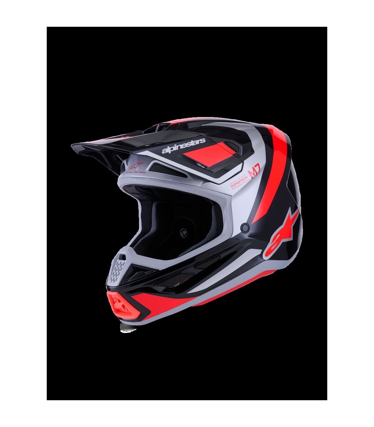 SM7 Rise HelmetThe SM7 helmet is engineered for off-road racing combining impact protection and comfort.Outer shell composite construction is lightweight and durable.Outer shell's aerodynamic profile has been designed reduce friction on impact, allowing deflection and the most efficient transfer of energy to protect the rider's head from direct force, referred to the neck and spinal column.Thanks to 20 individual intake and exhaust ports, not including the eye port, with 13 intakes and 8 exhausts this helmet is ultra-ventilated. Patented visor detaching system is engineered to automatically detach visor from the shell when subjected to an impact energy greater than 15 joules for optimum impact protection, regardless of the direction.Alpinestars patented Plasma technology is strategically-integrated into the SM7's side pads for high performance shock absorption in critical area to reduce the risk of injuries significantly. Linings are removable and washable.The Cheek Pads are fitted 3D foam, with an emergency extraction system (ERS), with a channel for hydration tube installation. Cheek pads are interchangeable among all sizes.Crown Pad and the Neck Pad are elastically connected, for better oblique impact management.Top Pad is removable and adjustable in height thanks to the A-head system.Chin strap is fitted with a 25 mm width nylon strap, stainless steel DD rings, removable covers for washing purpose.Shell sizing solution ensures each helmet fit size has its own appropriate shell size to deliver the most anatomical fit.Three different helmet shell sizes M, L and XL, and 6 consumer sizes from XS to XXL to ensure correct fit. Improving comfort, effectiveness of the helmet in an impact and reducing overall weight.Fit can further be customized via Alpinestars genuine replacement cheekpads available in all thicknesses and are exchangeable between all shell sizes.Both sides have integrated channels to accommodate hydration system.Communication system compatible thanks to cutaway section on the left-side of the EPS to seamlessly accommodate Intercom Systems, with earphone recesses on both sides for speakers.