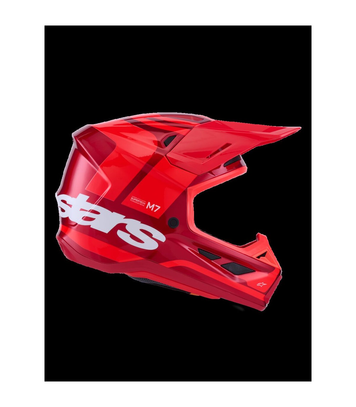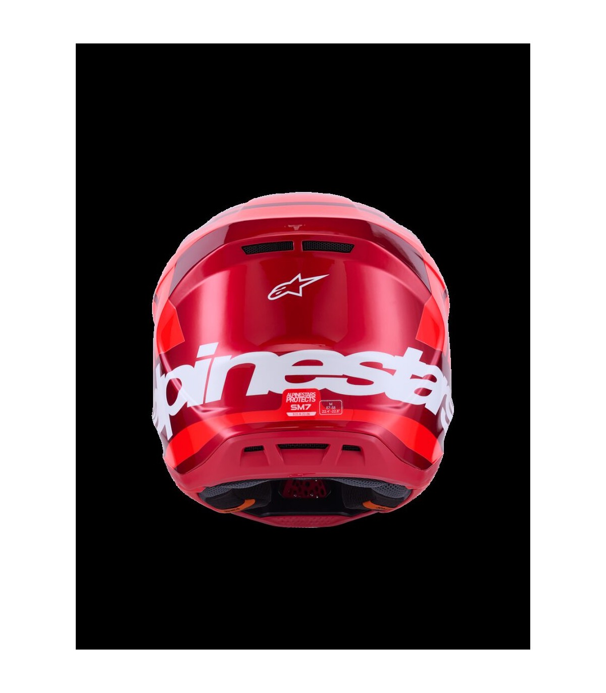 SM7 Core HelmetThe SM7 helmet is engineered for off-road racing combining impact protection and comfort.Outer shell composite construction is lightweight and durable.Outer shell's aerodynamic profile has been designed reduce friction on impact, allowing deflection and the most efficient transfer of energy to protect the rider's head from direct force, referred to the neck and spinal column.Thanks to 20 individual intake and exhaust ports, not including the eye port, with 13 intakes and 8 exhausts this helmet is ultra-ventilated. Patented visor detaching system is engineered to automatically detach visor from the shell when subjected to an impact energy greater than 15 joules for optimum impact protection, regardless of the direction.Alpinestars patented Plasma technology is strategically-integrated into the SM7's side pads for high performance shock absorption in critical area to reduce the risk of injuries significantly. Linings are removable and washable.The Cheek Pads are fitted 3D foam, with an emergency extraction system (ERS), with a channel for hydration tube installation. Cheek pads are interchangeable among all sizes.Crown Pad and the Neck Pad are elastically connected, for better oblique impact management.Top Pad is removable and adjustable in height thanks to the A-head system.Chin strap is fitted with a 25 mm width nylon strap, stainless steel DD rings, removable covers for washing purpose.Shell sizing solution ensures each helmet fit size has its own appropriate shell size to deliver the most anatomical fit.Three different helmet shell sizes M, L and XL, and 6 consumer sizes from XS to XXL to ensure correct fit. Improving comfort, effectiveness of the helmet in an impact and reducing overall weight.Fit can further be customized via Alpinestars genuine replacement cheekpads available in all thicknesses and are exchangeable between all shell sizes.Both sides have integrated channels to accommodate hydration system.Communication system compatible thanks to cutaway section on the left-side of the EPS to seamlessly accommodate Intercom Systems, with earphone recesses on both sides for speakers.