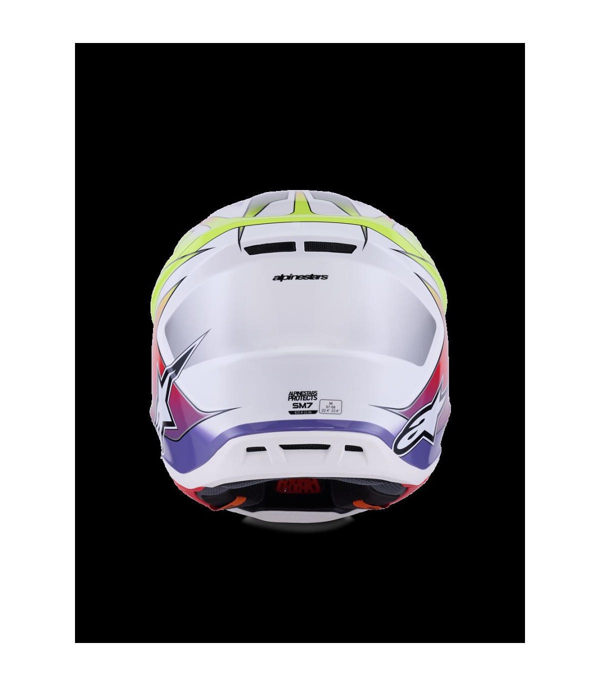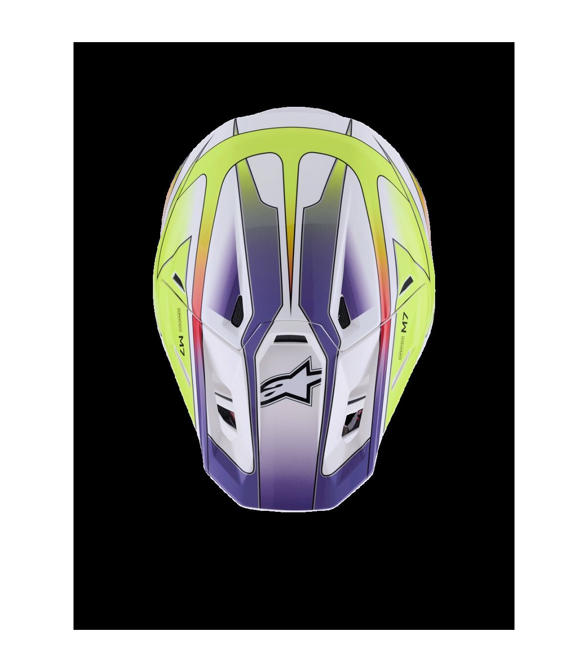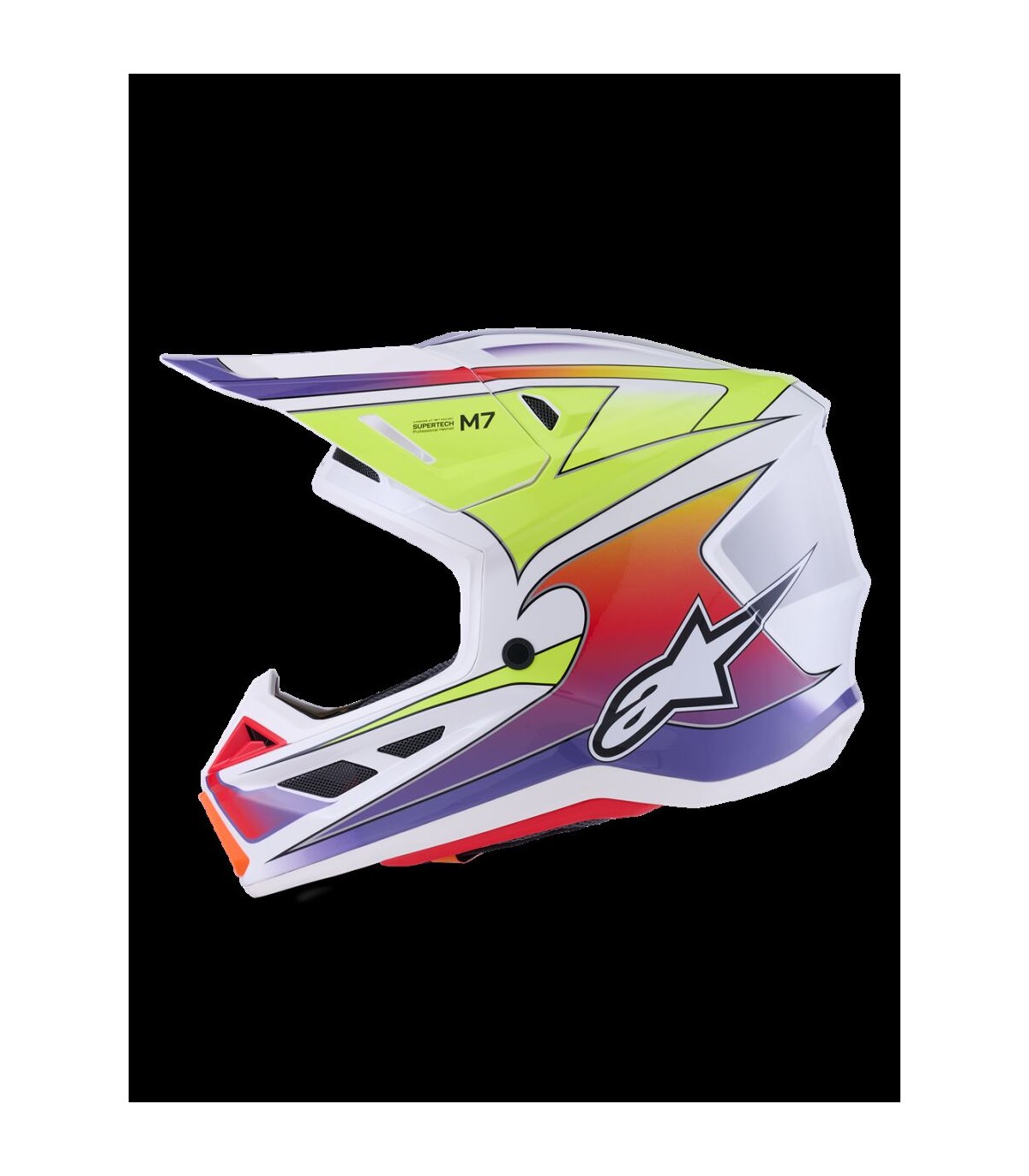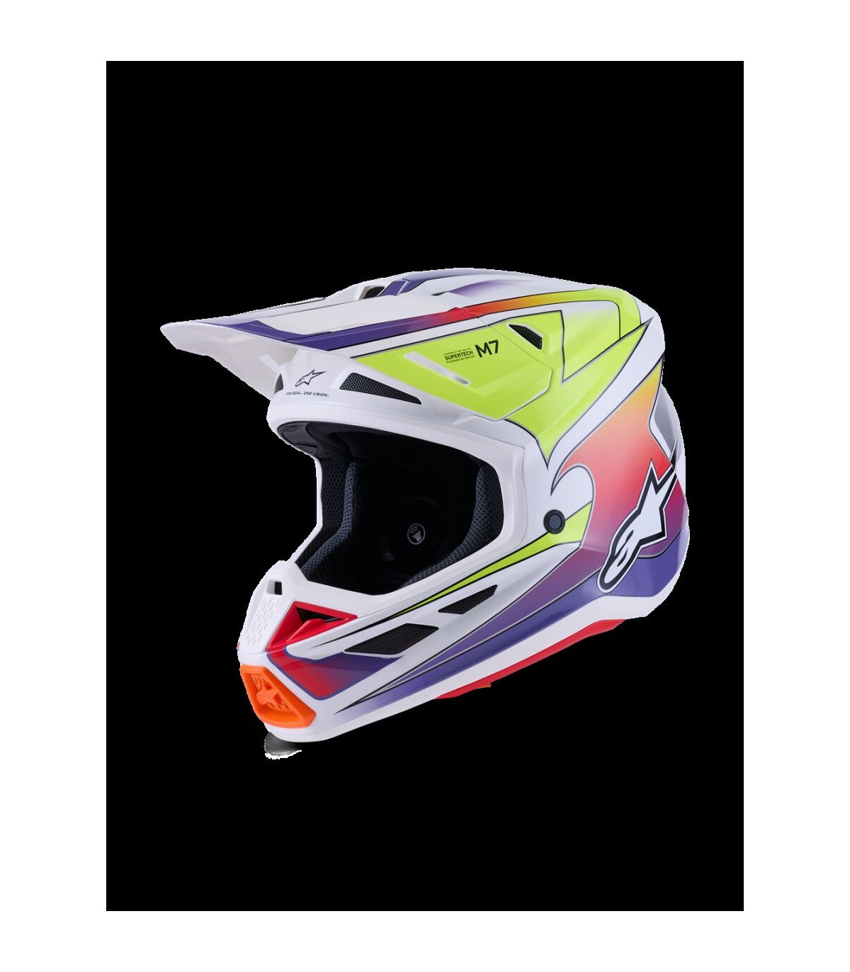 SM7 Fuse HelmetThe SM7 helmet is engineered for off-road racing combining impact protection and comfort.Outer shell composite construction is lightweight and durable.Outer shell's aerodynamic profile has been designed reduce friction on impact, allowing deflection and the most efficient transfer of energy to protect the rider's head from direct force, referred to the neck and spinal column.Thanks to 20 individual intake and exhaust ports, not including the eye port, with 13 intakes and 8 exhausts this helmet is ultra-ventilated. Patented visor detaching system is engineered to automatically detach visor from the shell when subjected to an impact energy greater than 15 joules for optimum impact protection, regardless of the direction.Alpinestars patented Plasma technology is strategically-integrated into the SM7's side pads for high performance shock absorption in critical area to reduce the risk of injuries significantly. Linings are removable and washable.The Cheek Pads are fitted 3D foam, with an emergency extraction system (ERS), with a channel for hydration tube installation. Cheek pads are interchangeable among all sizes.Crown Pad and the Neck Pad are elastically connected, for better oblique impact management.Top Pad is removable and adjustable in height thanks to the A-head system.Chin strap is fitted with a 25 mm width nylon strap, stainless steel DD rings, removable covers for washing purpose.Shell sizing solution ensures each helmet fit size has its own appropriate shell size to deliver the most anatomical fit.Three different helmet shell sizes M, L and XL, and 6 consumer sizes from XS to XXL to ensure correct fit. Improving comfort, effectiveness of the helmet in an impact and reducing overall weight.Fit can further be customized via Alpinestars genuine replacement cheekpads available in all thicknesses and are exchangeable between all shell sizes.Both sides have integrated channels to accommodate hydration system.Communication system compatible thanks to cutaway section on the left-side of the EPS to seamlessly accommodate Intercom Systems, with earphone recesses on both sides for speakers.