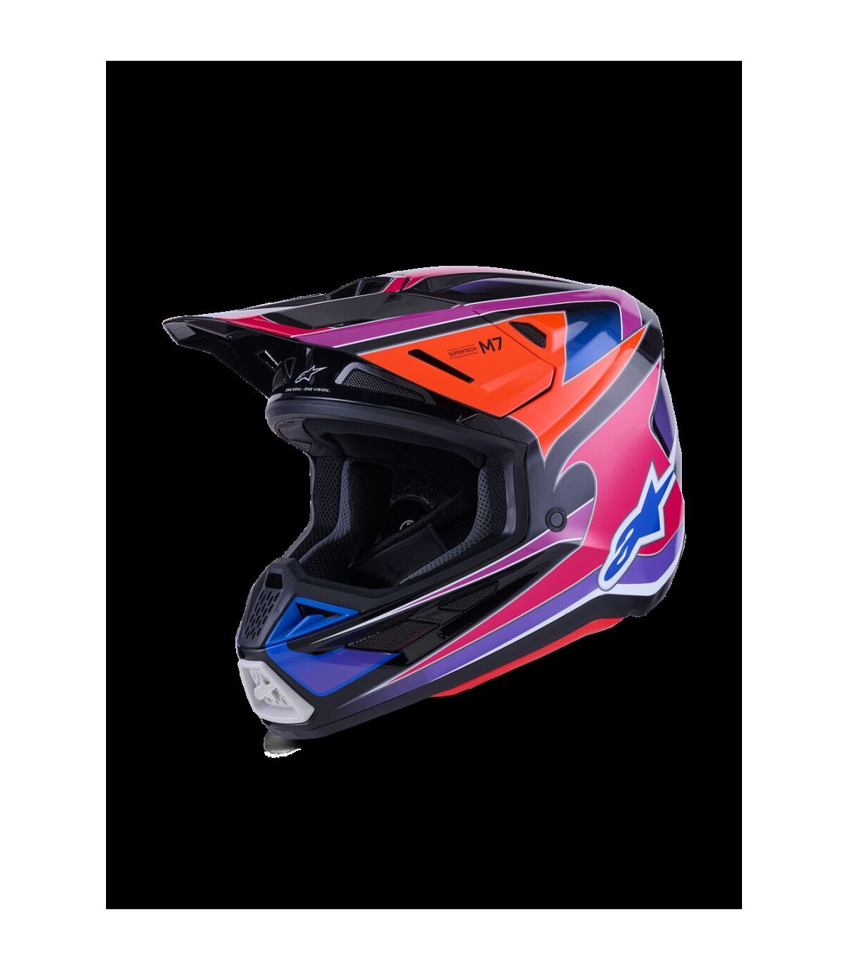 SM7 Fuse HelmetThe SM7 helmet is engineered for off-road racing combining impact protection and comfort.Outer shell composite construction is lightweight and durable.Outer shell's aerodynamic profile has been designed reduce friction on impact, allowing deflection and the most efficient transfer of energy to protect the rider's head from direct force, referred to the neck and spinal column.Thanks to 20 individual intake and exhaust ports, not including the eye port, with 13 intakes and 8 exhausts this helmet is ultra-ventilated. Patented visor detaching system is engineered to automatically detach visor from the shell when subjected to an impact energy greater than 15 joules for optimum impact protection, regardless of the direction.Alpinestars patented Plasma technology is strategically-integrated into the SM7's side pads for high performance shock absorption in critical area to reduce the risk of injuries significantly. Linings are removable and washable.The Cheek Pads are fitted 3D foam, with an emergency extraction system (ERS), with a channel for hydration tube installation. Cheek pads are interchangeable among all sizes.Crown Pad and the Neck Pad are elastically connected, for better oblique impact management.Top Pad is removable and adjustable in height thanks to the A-head system.Chin strap is fitted with a 25 mm width nylon strap, stainless steel DD rings, removable covers for washing purpose.Shell sizing solution ensures each helmet fit size has its own appropriate shell size to deliver the most anatomical fit.Three different helmet shell sizes M, L and XL, and 6 consumer sizes from XS to XXL to ensure correct fit. Improving comfort, effectiveness of the helmet in an impact and reducing overall weight.Fit can further be customized via Alpinestars genuine replacement cheekpads available in all thicknesses and are exchangeable between all shell sizes.Both sides have integrated channels to accommodate hydration system.Communication system compatible thanks to cutaway section on the left-side of the EPS to seamlessly accommodate Intercom Systems, with earphone recesses on both sides for speakers.
