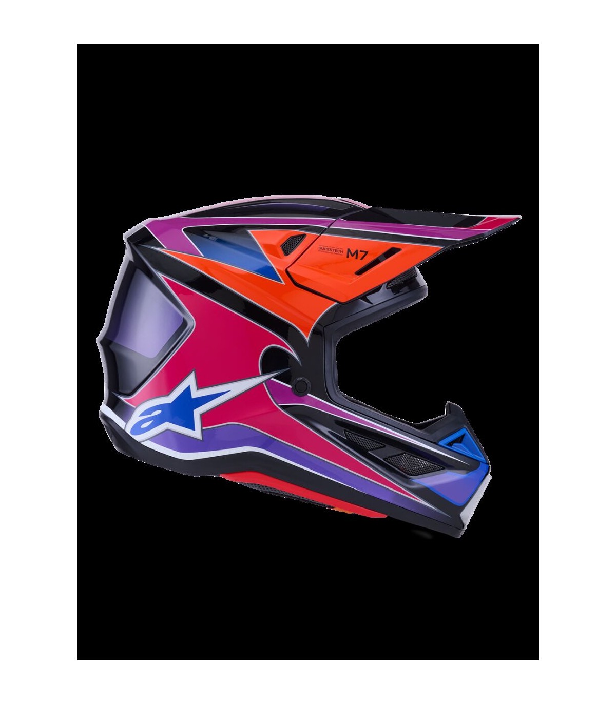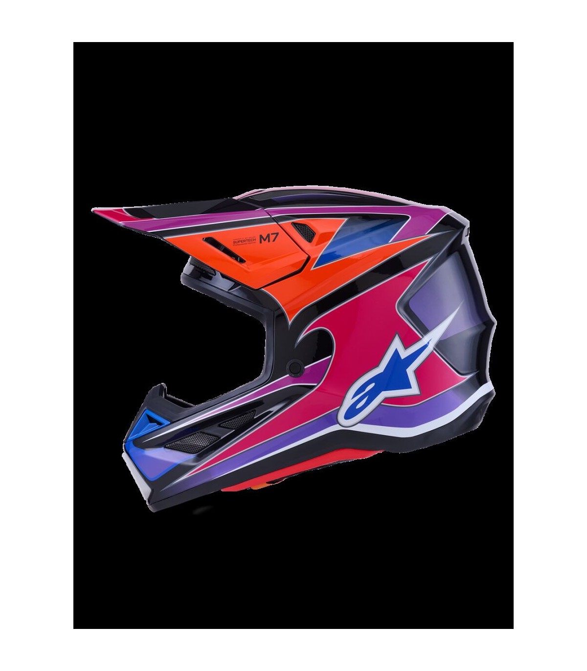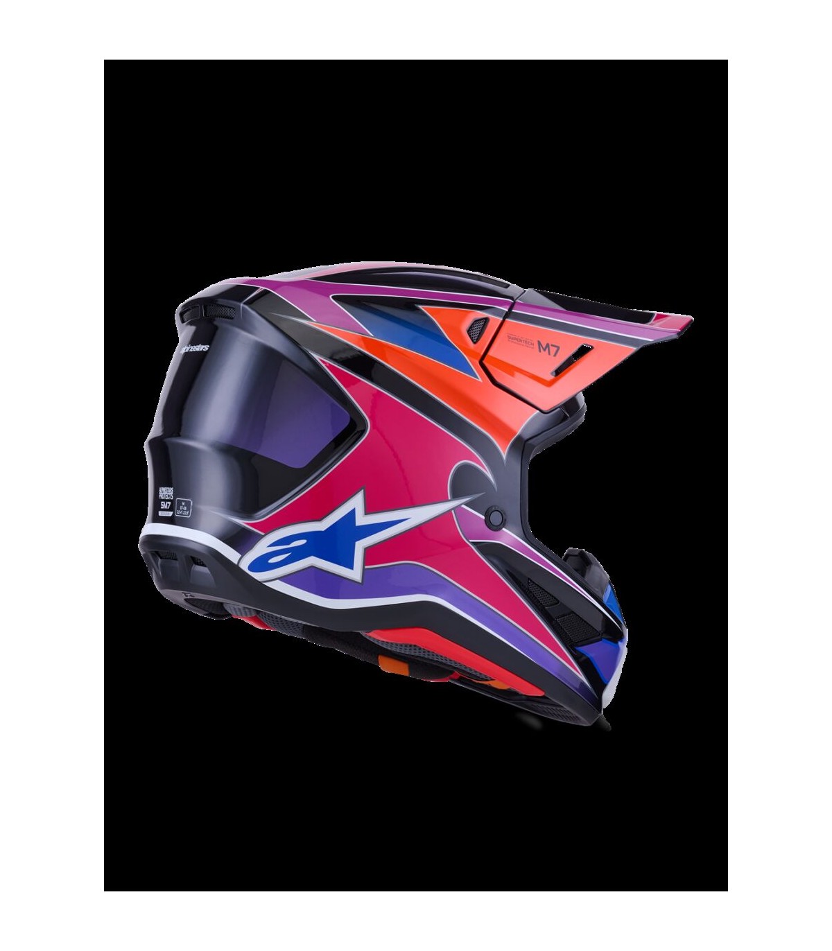 SM7 Fuse HelmetThe SM7 helmet is engineered for off-road racing combining impact protection and comfort.Outer shell composite construction is lightweight and durable.Outer shell's aerodynamic profile has been designed reduce friction on impact, allowing deflection and the most efficient transfer of energy to protect the rider's head from direct force, referred to the neck and spinal column.Thanks to 20 individual intake and exhaust ports, not including the eye port, with 13 intakes and 8 exhausts this helmet is ultra-ventilated. Patented visor detaching system is engineered to automatically detach visor from the shell when subjected to an impact energy greater than 15 joules for optimum impact protection, regardless of the direction.Alpinestars patented Plasma technology is strategically-integrated into the SM7's side pads for high performance shock absorption in critical area to reduce the risk of injuries significantly. Linings are removable and washable.The Cheek Pads are fitted 3D foam, with an emergency extraction system (ERS), with a channel for hydration tube installation. Cheek pads are interchangeable among all sizes.Crown Pad and the Neck Pad are elastically connected, for better oblique impact management.Top Pad is removable and adjustable in height thanks to the A-head system.Chin strap is fitted with a 25 mm width nylon strap, stainless steel DD rings, removable covers for washing purpose.Shell sizing solution ensures each helmet fit size has its own appropriate shell size to deliver the most anatomical fit.Three different helmet shell sizes M, L and XL, and 6 consumer sizes from XS to XXL to ensure correct fit. Improving comfort, effectiveness of the helmet in an impact and reducing overall weight.Fit can further be customized via Alpinestars genuine replacement cheekpads available in all thicknesses and are exchangeable between all shell sizes.Both sides have integrated channels to accommodate hydration system.Communication system compatible thanks to cutaway section on the left-side of the EPS to seamlessly accommodate Intercom Systems, with earphone recesses on both sides for speakers.