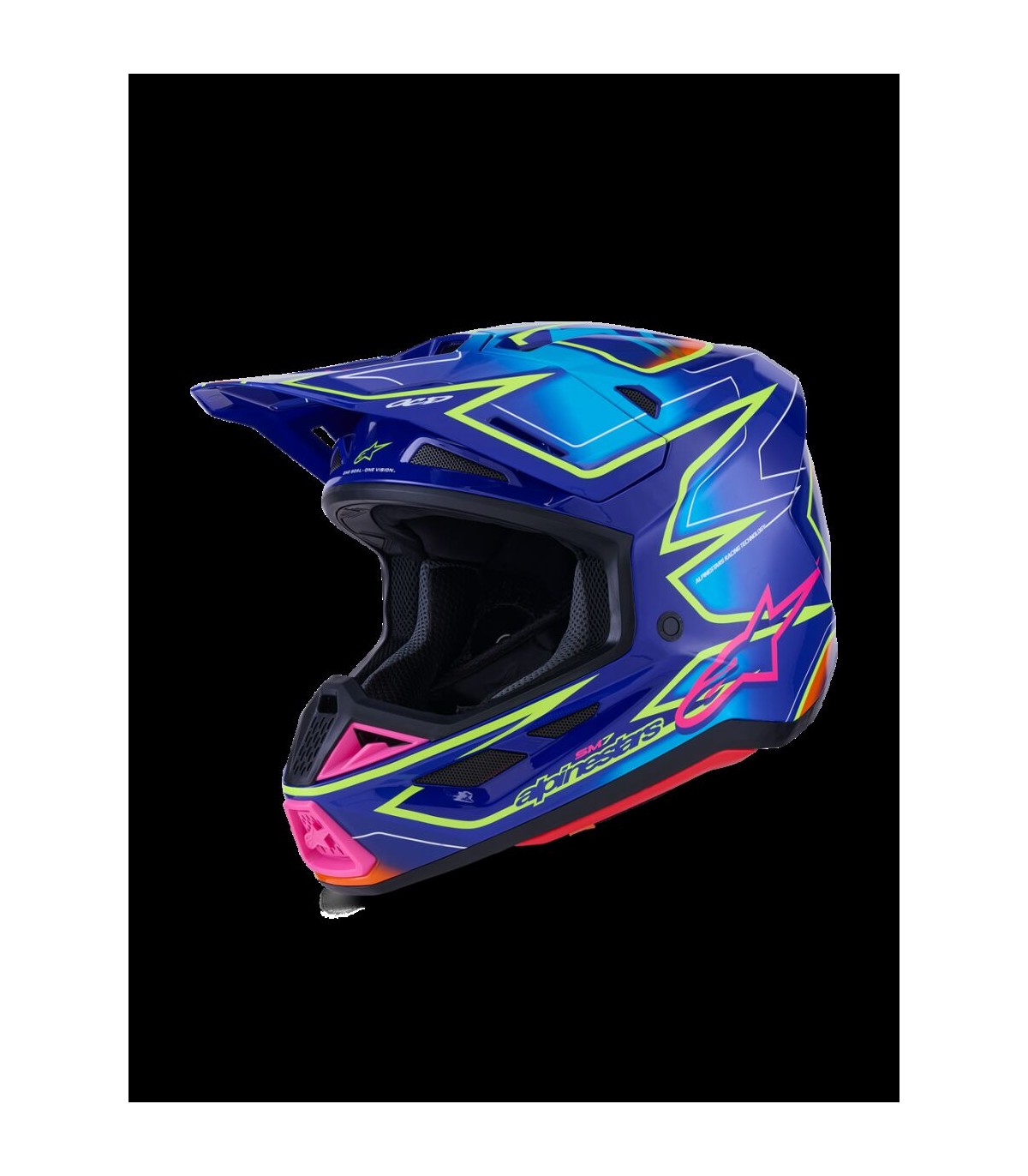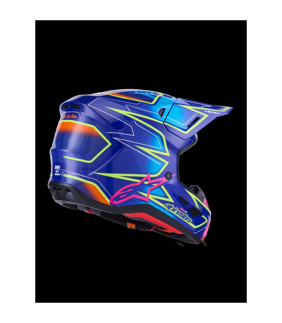 SM7 Cast HelmetThe SM7 helmet is engineered for off-road racing combining impact protection and comfort.Outer shell composite construction is lightweight and durable.Outer shell's aerodynamic profile has been designed reduce friction on impact, allowing deflection and the most efficient transfer of energy to protect the rider's head from direct force, referred to the neck and spinal column.Thanks to 20 individual intake and exhaust ports, not including the eye port, with 13 intakes and 8 exhausts this helmet is ultra-ventilated. Patented visor detaching system is engineered to automatically detach visor from the shell when subjected to an impact energy greater than 15 joules for optimum impact protection, regardless of the direction.Alpinestars patented Plasma technology is strategically-integrated into the SM7's side pads for high performance shock absorption in critical area to reduce the risk of injuries significantly. Linings are removable and washable.The Cheek Pads are fitted 3D foam, with an emergency extraction system (ERS), with a channel for hydration tube installation. Cheek pads are interchangeable among all sizes.Crown Pad and the Neck Pad are elastically connected, for better oblique impact management.Top Pad is removable and adjustable in height thanks to the A-head system.Chin strap is fitted with a 25 mm width nylon strap, stainless steel DD rings, removable covers for washing purpose.Shell sizing solution ensures each helmet fit size has its own appropriate shell size to deliver the most anatomical fit.Three different helmet shell sizes M, L and XL, and 6 consumer sizes from XS to XXL to ensure correct fit. Improving comfort, effectiveness of the helmet in an impact and reducing overall weight.Fit can further be customized via Alpinestars genuine replacement cheekpads available in all thicknesses and are exchangeable between all shell sizes.Both sides have integrated channels to accommodate hydration system.Communication system compatible thanks to cutaway section on the left-side of the EPS to seamlessly accommodate Intercom Systems, with earphone recesses on both sides for speakers.