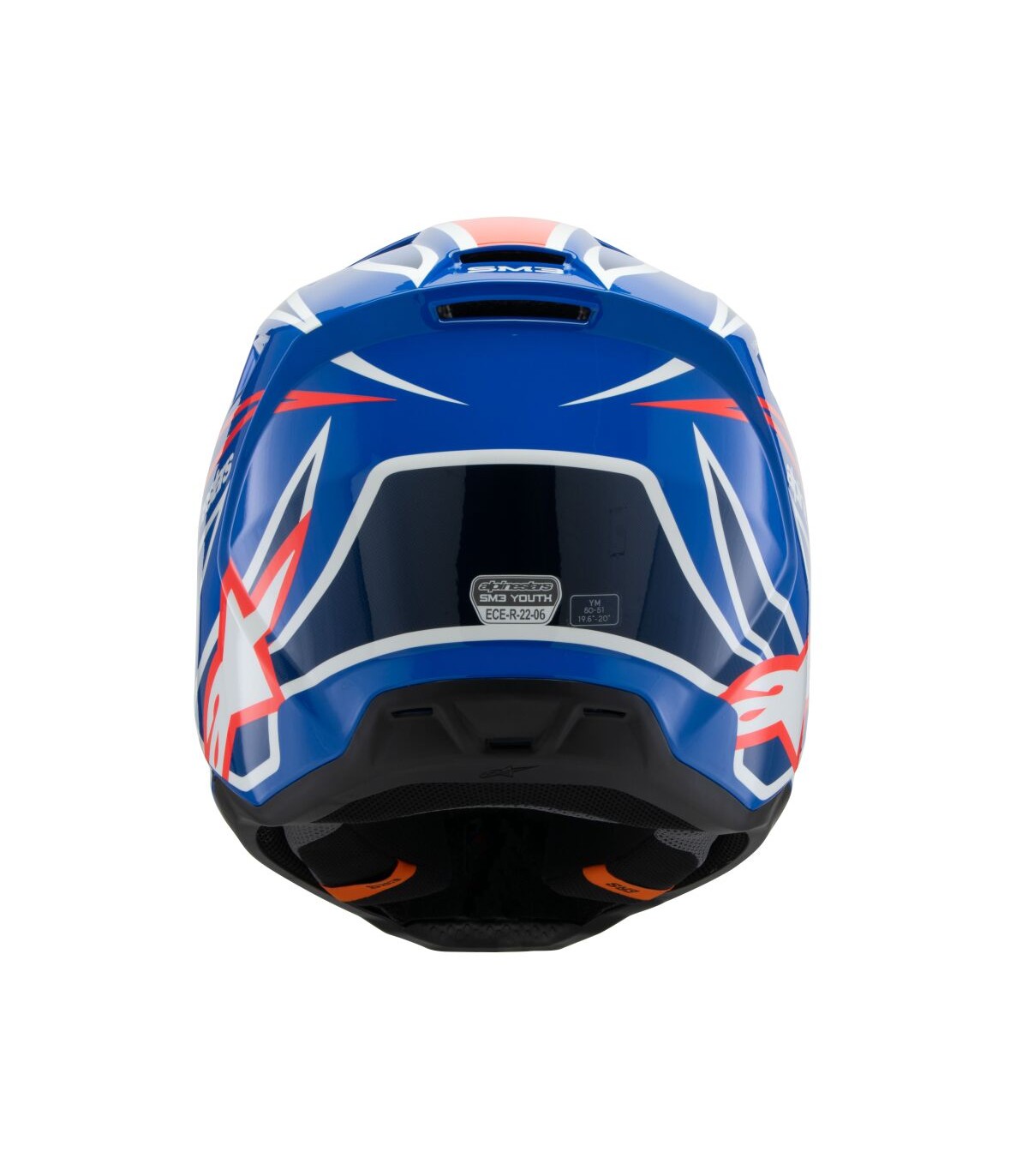 Youth S-M3 Wurx HelmetAnatomically engineered and profiled specifically for youth and younger riders, the all-new SM3 Youth Helmet is optimized for MX, Enduro and Off-road use.This lightweight helmet features a thermo-injected shell incorporating a special polymer blend enhanced by varying degrees of thickness that is engineered to deliver the optimal combination of impact protection and light weight. Lightweight outer shell is constructed from a technologically advanced impact resistant thermoplastic in three sizes (Youth Small, Youth Medium and Youth Large. The SM3 Youth weighs 1060g.The fit can be tailored to the rider’s head thanks to the helmet’s crown and cheek pads, which are available as genuine spare parts in different thicknesses.Youth Medium and Youth Large sizes share the same EPS size, which allows riders with an YM size to initially buy an YM helmet and then configure it to a Youth Large size as they grow via the crown and cheek pad spare parts.The Youth Small has a smaller EPS size and can be customized only via the cheek pads. Alpinestars extensive research has shown that the kids that wear a YS size are very small, typically 3 to 4 years old, and therefore they require a dedicated helmet fit.Multiple density inner liner ensures the helmet is equipped with the correct density in the correct area for enhanced impact absorption, while also helping reduce overall weight.The inner and outer surfaces are engineered to minimize the effects of oblique impacts.Alpinestars patented low friction coating is applied to the inner part of the main EPS liner to reduce the rotational acceleration forces that can result from certain oblique impacts. This layer essentially acts as a slip plane to mimic the brain’s own low friction cerebrospinal fluid, which is the body’s natural defense against oblique impacts.Patented visor release system ensures the visor is released with the correct pre-determined amount of force, effectively reducing the forces on the rider’s neck during an impact.Comfort liner is constructed using recycled materials for a lower carbon footprint.Hydration tube channels are integrated into the helmet’s cheek pads for convenience and performance.SafetyAlpinestars has introduced a new in-house standard for the SM3 Youth to test the helmet’s chin to conditions heavier than the homologation standard, and in order to pass the Alpinestars’ new standards, the shell thickness and the structure of the helmet design itself have both been optimized on the chin area for superior impact performance.Equipped with an Emergency Release System and removable cheek pads to permit the safe and easy removal of the cheek pads while the helmet is still on, while the 3D contoured foam ensures rider comfort.Soft textile chin strap is 25mm for optimal safety and rider comfort.Stainless steel D-rings ensure a tight and secure fit.VentilationMaximized ventilation and high levels of heat transfer exchange thanks to 10 inlets and seven exhaust ports.The visor has been designed to direct air into the ports for enhanced airflow.