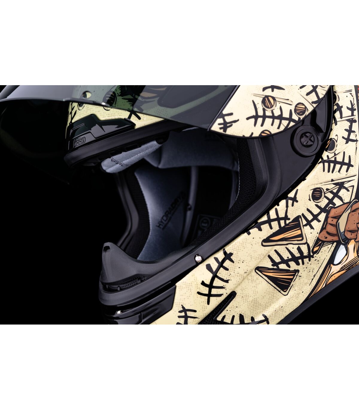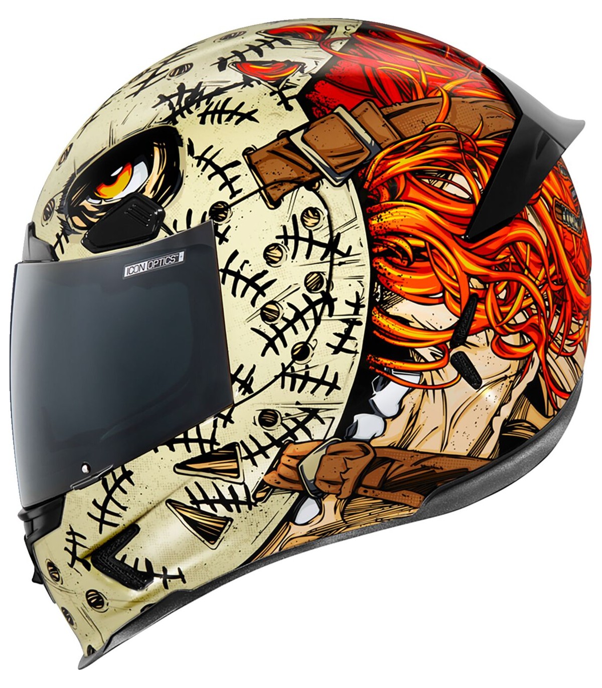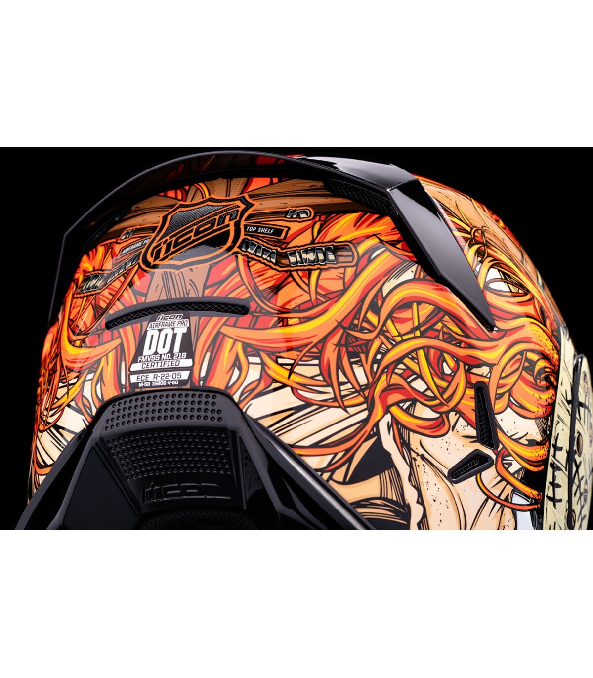 Airframe Pro™ TopShelf HelmetFive-piece modular liner with moisture-wicking Hydradry™Low-profile vents throughout the shellProlock™ positive shield locking systemSculpted neck roll reduces jacket/suit interferenceFog-free ICON Optics™ Shield with Rapid-Release™ systemLinear ported forehead ventsRemovable breath deflector and chin curtainHandcrafted composite fiberglass FRP (fiber-reinforced plastic) shellIncludes Clear & Dark Smoke ICON Optics™ Shield