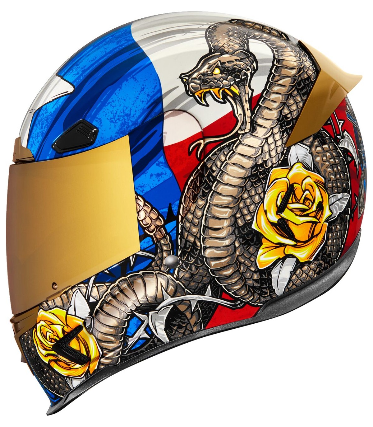 Airframe Pro™ Tejas Libre HelmetLinear ported forehead ventsFive-piece modular liner with moisture-wicking Hydradry™Low-profile vents throughout the shellProlock™ positive shield locking systemSculpted neck roll reduces jacket/suit interferenceFog-free ICON Optics™ Shield with Rapid-Release™ systemRemovable breath deflector and chin curtainIncludes Clear & RST Bronze Icon Optics™ shields
