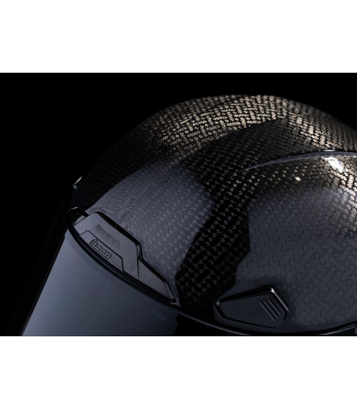 Airframe Pro™ Carbon 4Tress HelmetHandcrafted composite carbon fiber shellSculpted neck roll reduces jacket/suit interferenceFive-piece modular liner with moisture-wicking Hydradry™Linear ported forehead ventsLow-profile vents throughout the shellFog-free ICON Optics™ Shield with Rapid-Release™ systemProlock™ positive shield locking systemRemovable breath deflector and chin curtainIncludes Dark Smoke & Clear TracShields™