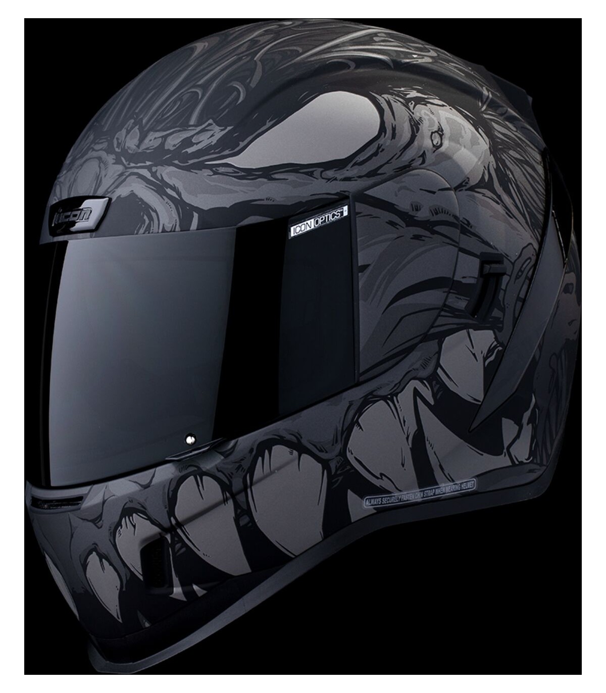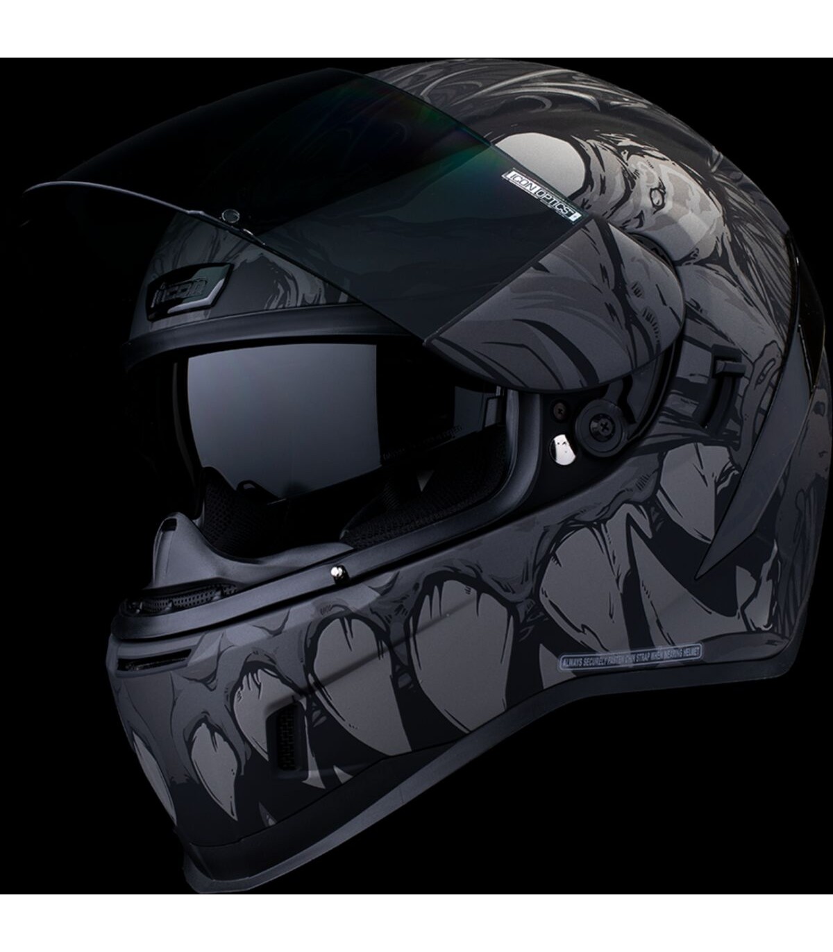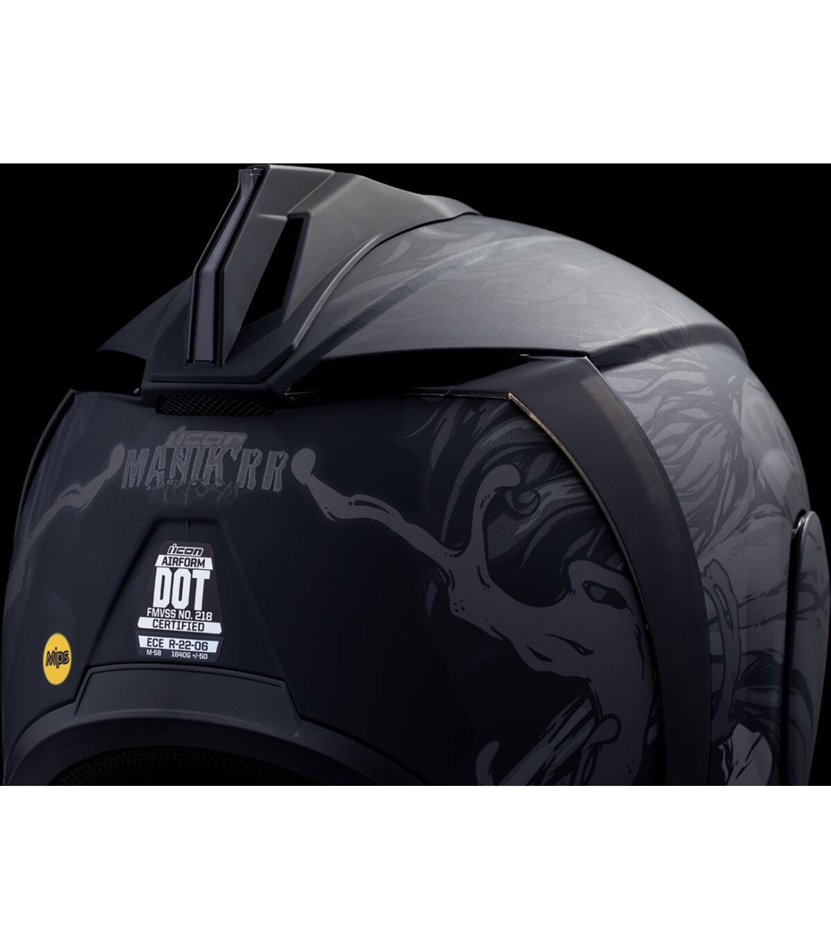 Airform™ Manik'RR MIPS® HelmetContinuous venting systemFog-free ICON Optics™ Shield with Rapid-Release™ SystemInjection molded polycarbonate shell for strengthInternal airflow geometrySculpted neck rollProlock™ positive shield locking systemRemovable molded breath deflectorThe Dropshield™ visor must only be used while the main face shield is in the fully closed positionInternal Dropshield™ with exterior switchRemovable Hydradry™ 3-piece moisture wicking linerInternal speaker pockets work with ICON's R.A.U. Bluetooth deviceIncludes Dark Smoke DropShield™ and Rubatone Black Speedfin™Includes Clear & Dark Smoke Optics™ Shields
