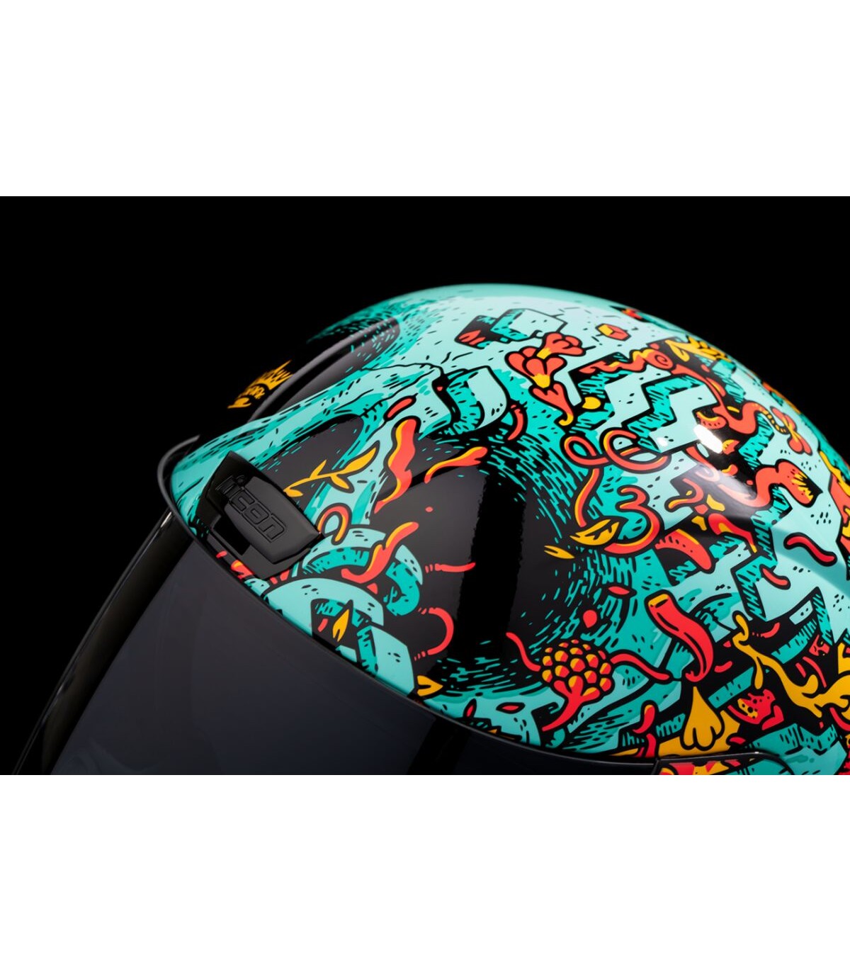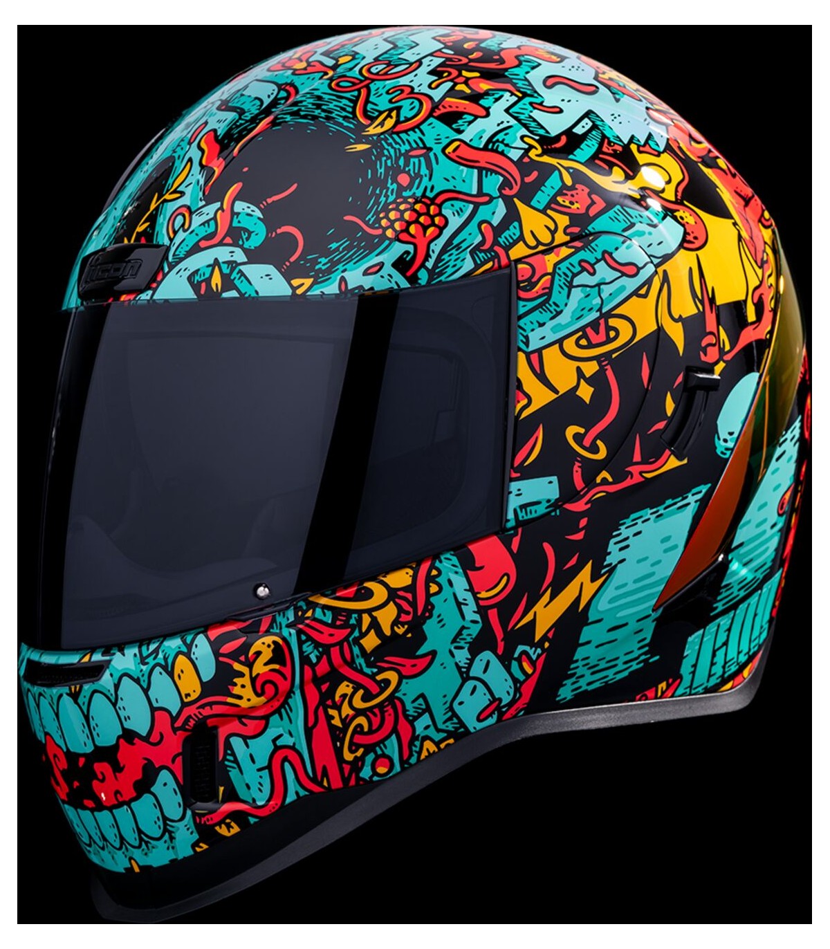 Airform™ Munchies MIPS® HelmetInternal airflow geometryFog-free ICON Optics™ Shield with Rapid-Release™ SystemInjection molded polycarbonate shell for strengthSculpted neck rollContinuous venting systemProlock™ positive shield locking systemInternal Dropshield™ with exterior switchThe Dropshield™ visor must only be used while the main face shield is in the fully closed positionRemovable molded breath deflectorRemovable Hydradry™ 3-piece moisture wicking linerInternal speaker pockets work with ICON's R.A.U. Bluetooth deviceIncludes Clear & Dark Smoke fog-free Optics™ shield