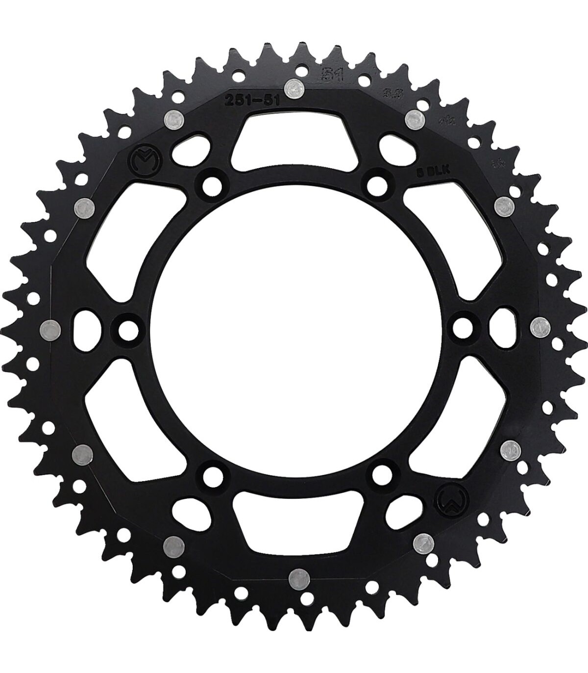 Dual SprocketDesigned to outlast standard aluminum rear sprockets and is much lighter than steel rear sprocketsInner ring is made from 7075 T6 aluminum and the outer ring is made from heavy duty steelSelf-cleaning mud grooves between each tooth to prevent dirt build up